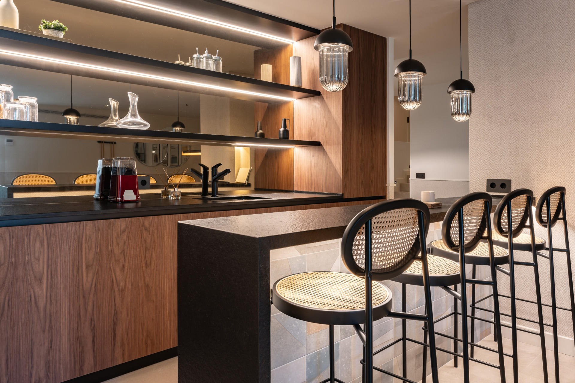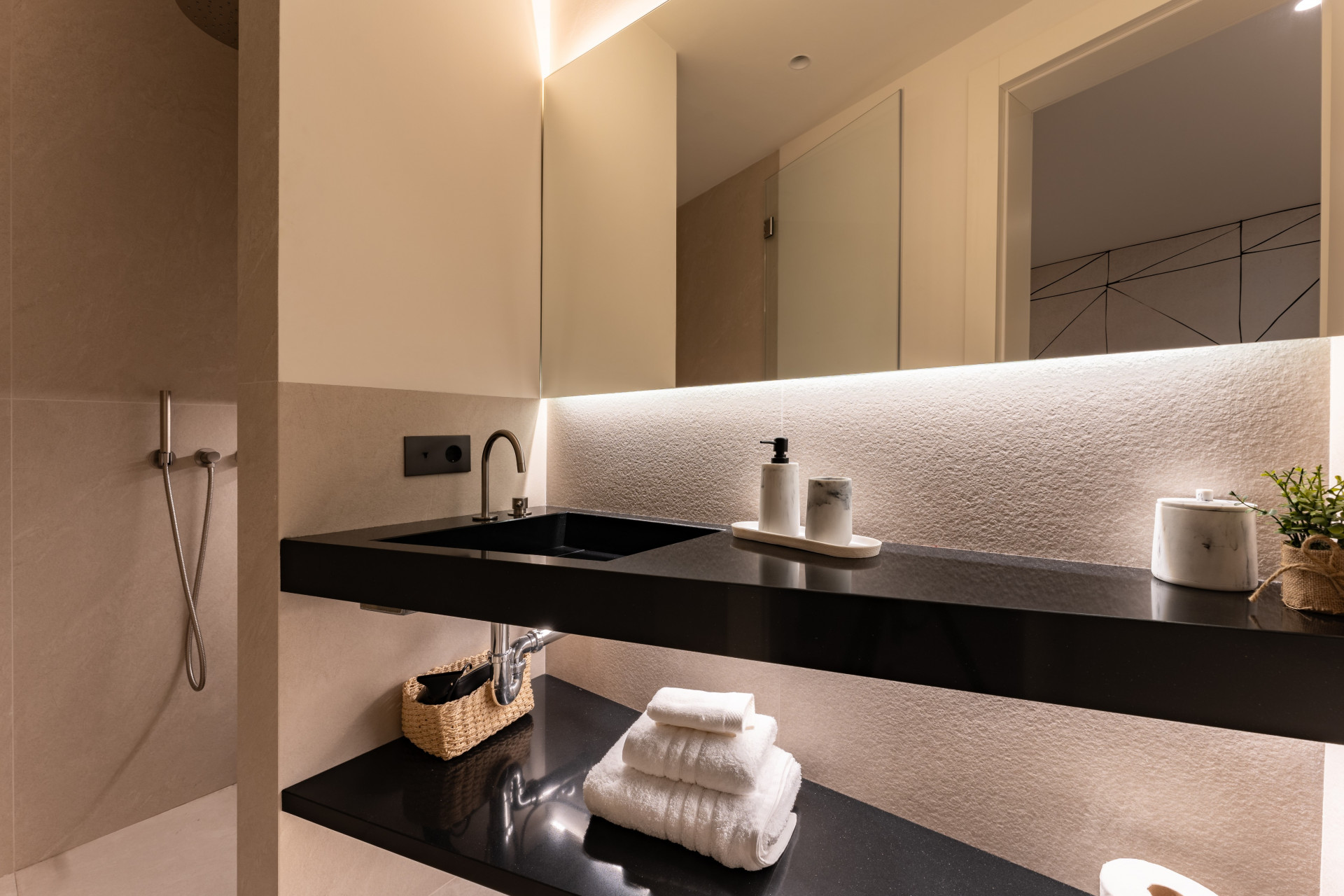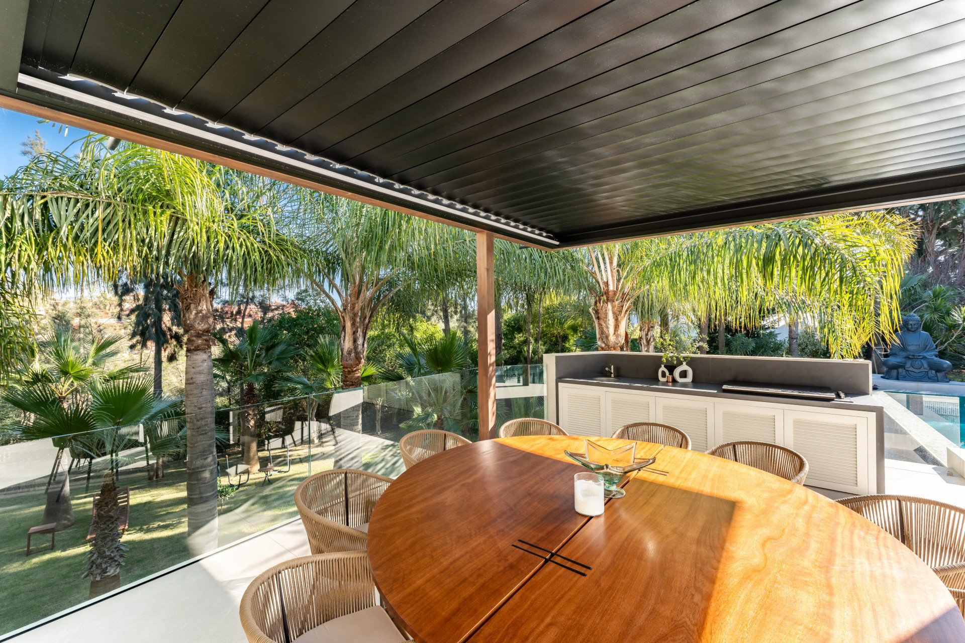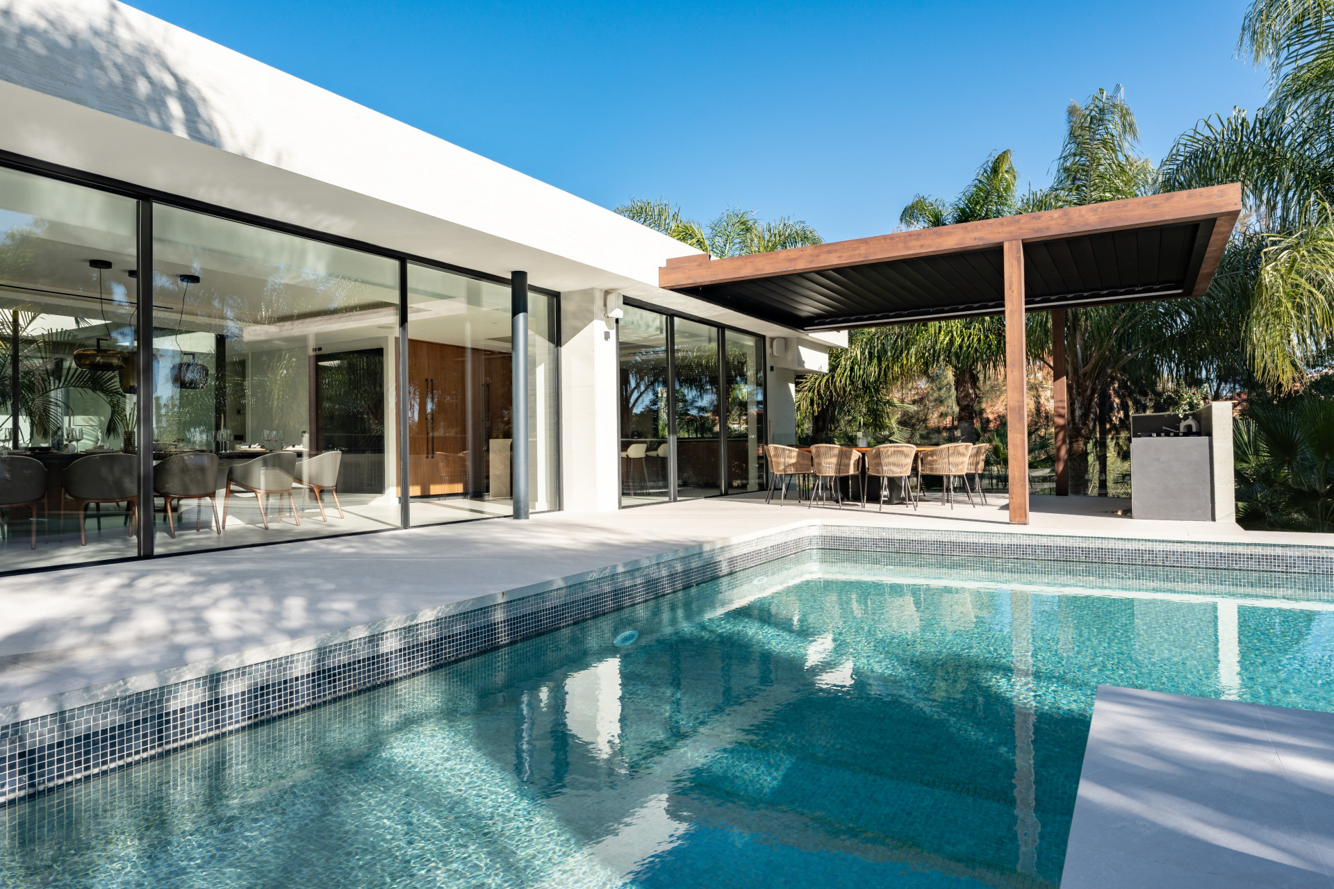 The villa can host a total of 8 guest with 4 bedrooms, each of them crafted with unique features and individually designed to a 5 star level. The ground floor welcomes the guests with a spacious living room, an open kitchen with glass doors opening to an al-fresco barbecue and dining area, inside a covered terrace overlooking the swimming pool and the wonderfully landscaped gardens. Additionally, this level includes three double bedrooms with ensuite bathrooms.