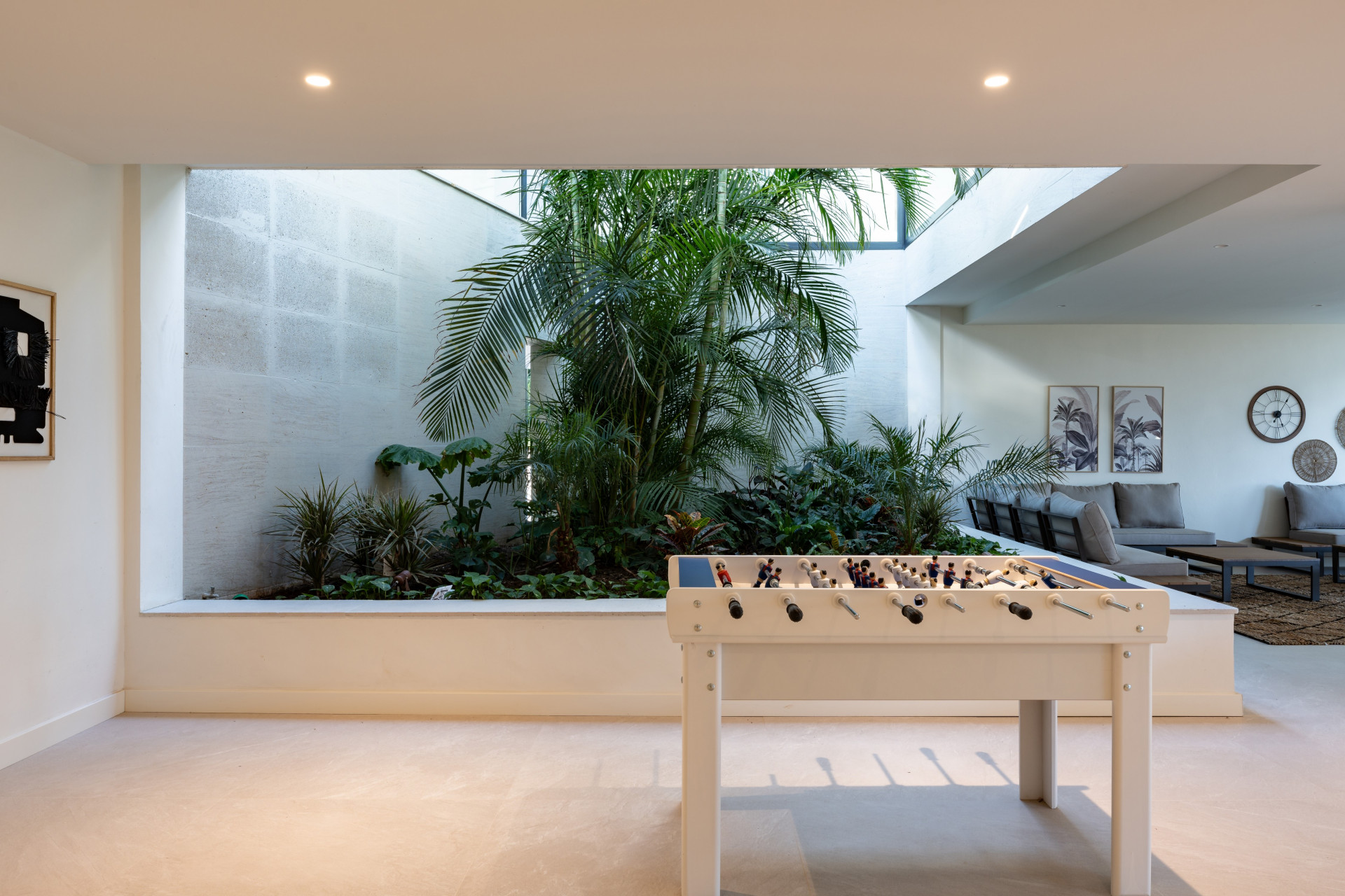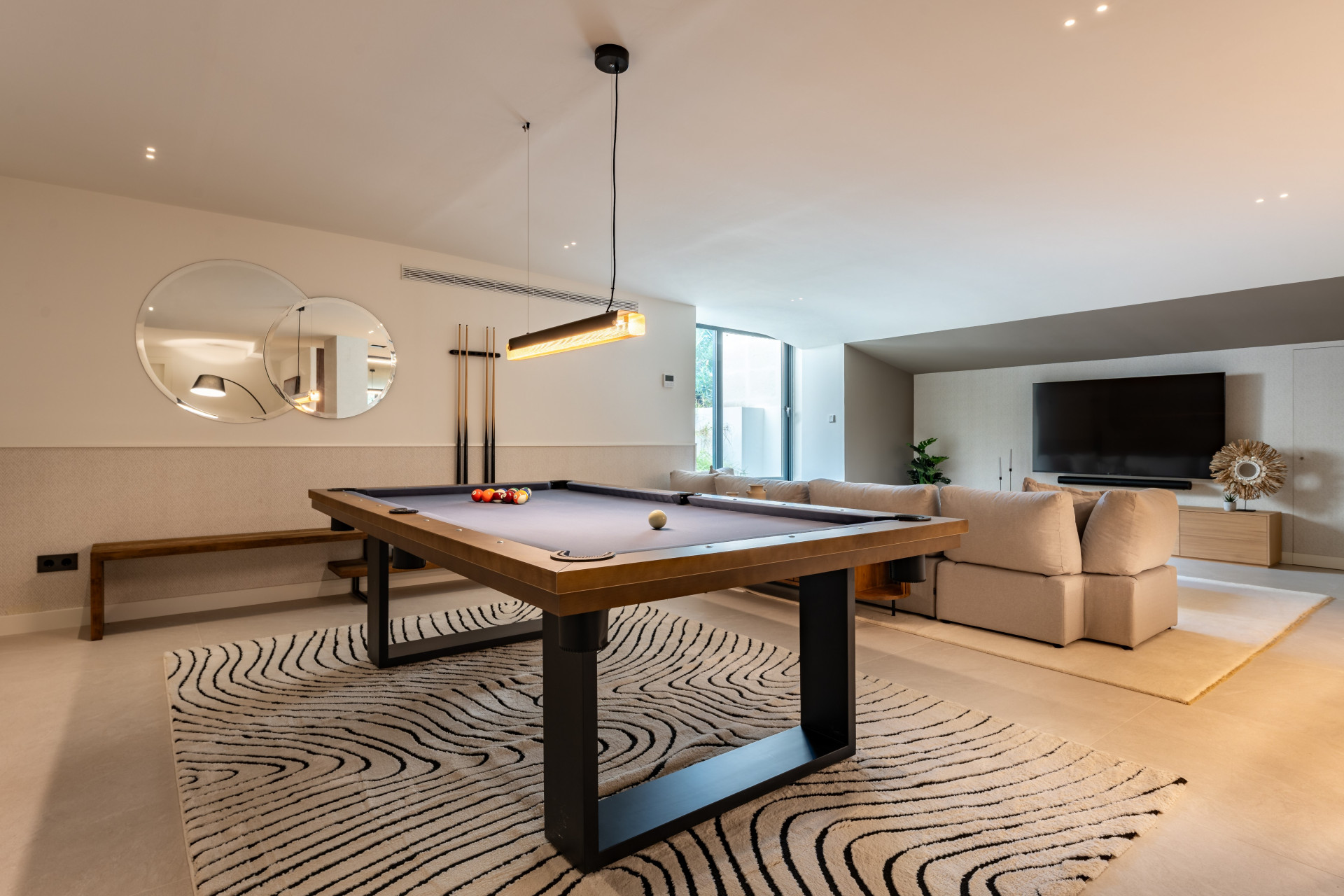 The lower ground level includes one double bedroom with ensuite bathroom, a game room equipped with a cinema, bar area with traditional seating, and pool table. There’s an inviting outdoor area that includes an open-air gym and a stylish outdoor living room, perfect for relaxation and entertaining.