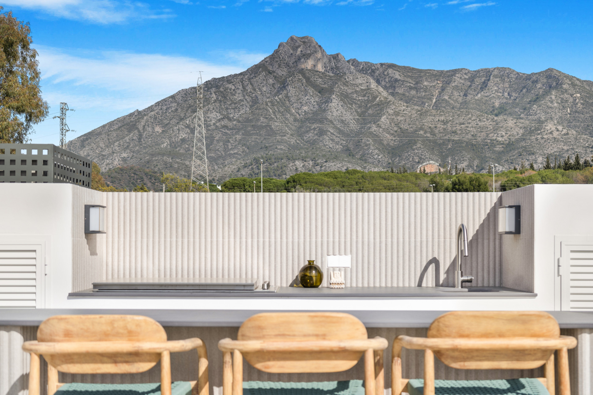 The villa's expansive terrace, spanning the south and east sides, beckons residents and guests alike to unwind and entertain. Furnished with sun loungers, dining areas, and a fully equipped barbecue kitchenette, this space is designed to be enjoyed throughout the year in Marbella's consistently warm climate.