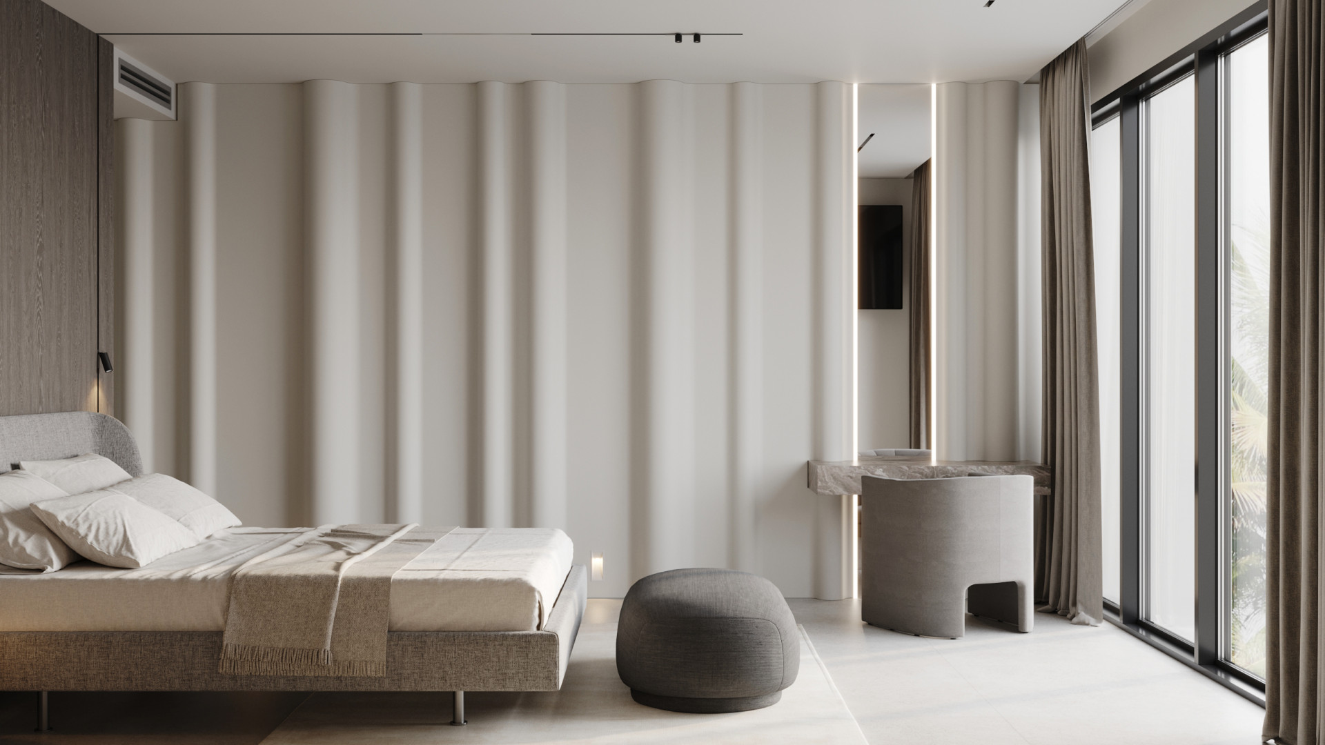 Surrounded by lush greenery and luxury properties, the villa of 515m2 plus 210m2 of terraces offers an elegant, eco-friendly contemporary design. The house is in harmony with its environment, boasting modern design, innovative technology, and high-quality materials. It includes spacious living rooms, chic bathrooms, a fully fitted open-plan kitchen, dining and entertaining areas, and a large basement for additional facilities like a gym, sauna, TV lounge, bar, or wine cellar. The Scandinavian-style interior uses minimalistic forms and colors, with light and soft natural shades such as greys, nudes, and wood tones.
