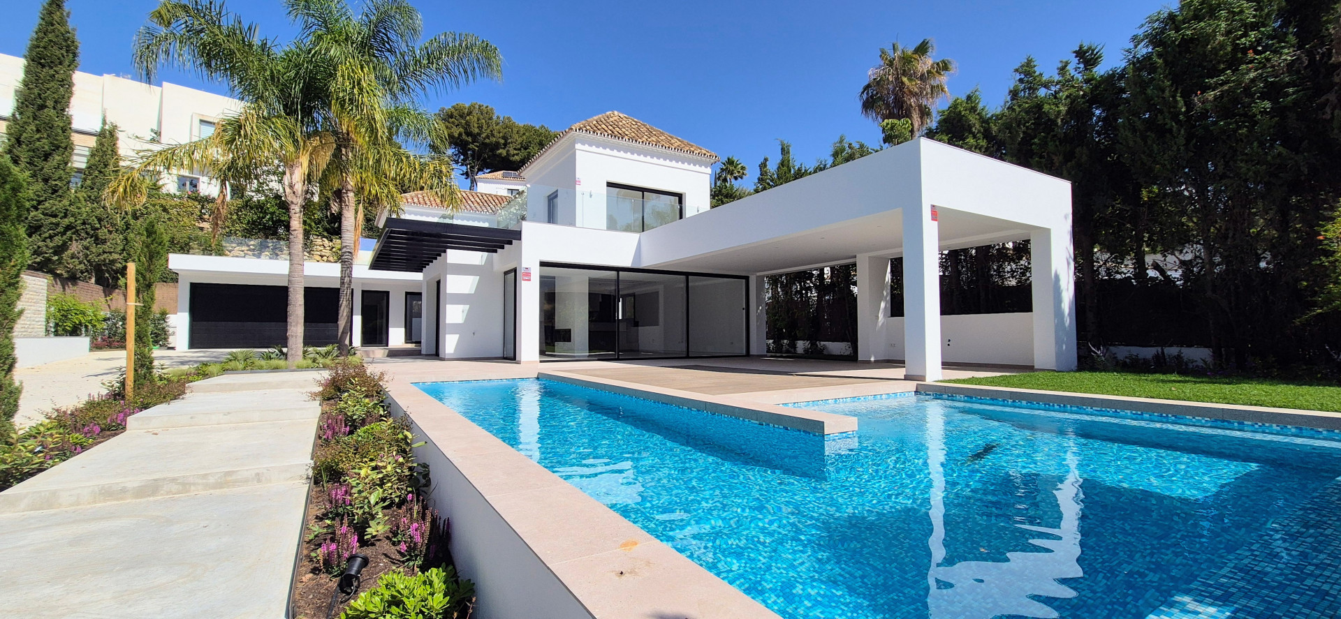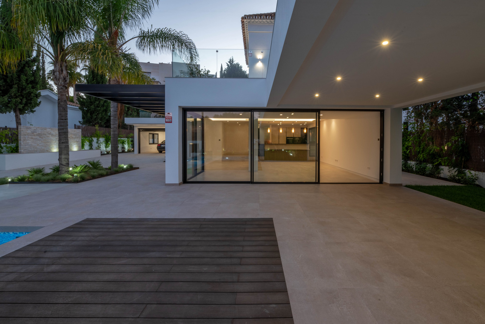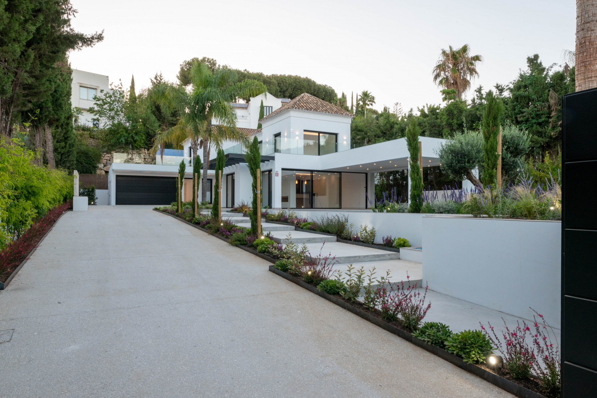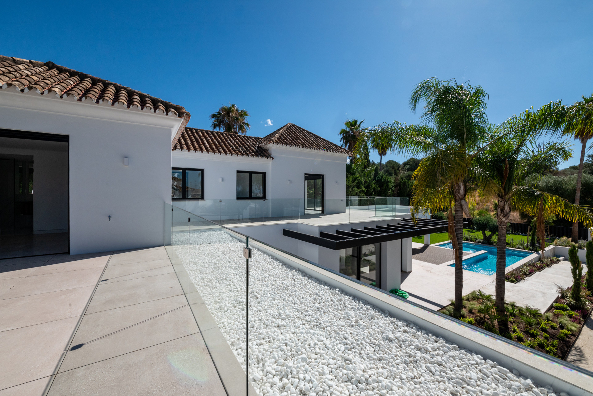 Beautiful five bedroom, south facing, newly built property located in a privileged area surrounded by the best golf courses on the Costa del Sol, El Paraiso, between the municipalities of Estepona and Benahavis. With a distribution designed to maximize comfort and elegance, on a plot of 1.065 m2, it has five bedrooms, each one designed to offer privacy and a cosy atmosphere. The five modern bathrooms are equipped with the best materials and advanced technology, providing an incomparable space for relaxation and well-being. Villa Camelia redefines luxury and comfort with its excellent quality finishes. Its private swimming pool is perfect for soaking up the sun and relaxing in a tranquil and exclusive setting. The beautiful garden, carefully designed, becomes a green oasis that offers a perfect space for relaxation and tranquillity, ideal to enjoy with family and friends. The spacious terraces are another attraction of this property, providing open spaces ideal for al fresco dining, social gatherings or simply relaxing in the tranquillity of the surroundings. The garage has capacity for two cars, guaranteeing security and comfort with easy access from the main entrance. The villa is equipped with an advanced aerothermal system, an efficient and sustainable air conditioning solution that ensures maximum comfort in all seasons of the year, also contributing to respect for the environment. Every detail of this villa has been carefully thought out to provide an atmosphere of luxury, modernity and comfort. From the selection of materials to the architectural design, everything has been conceived to offer an unparalleled living experience. This villa is not just a house, it is a home designed to offer an incomparable living experience, where every day will be a celebration of good taste and comfort.