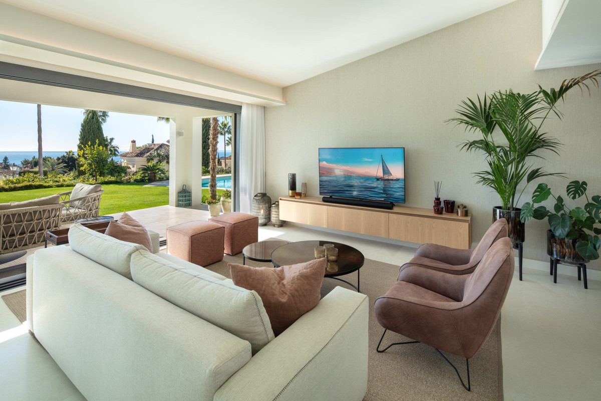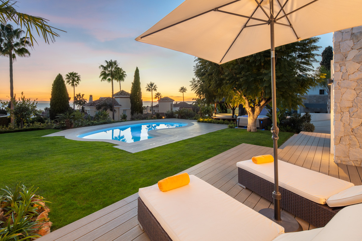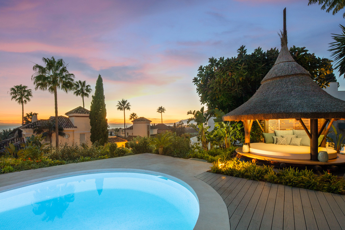Beautifully renovated single-level villa located in the sought-after community of El Rosario, Marbella East. This stylish three bedroom home perfectly combines effortless comfort with smart design, featuring a bright open-plan living space that flows seamlessly into lush outdoor areas. Floor-to-ceiling windows flood the interiors with natural light, while tasteful furnishings throughout create an atmosphere of understated elegance. Step outside into your private garden oasis, complete with a heated swimming pool, Jacuzzi, and multiple chill-out zones perfect for relaxing or entertaining. The villa offers a covered dining area, a poolside lounge, and a Bali-style cabana, providing the ideal setting for year-round enjoyment — whether for sunny morning breakfasts or golden-hour dinners. Located just minutes from Marbella’s finest beaches, renowned golf courses, and top international schools, this turnkey property offers both privacy and convenience. It’s an ideal choice for anyone seeking a full-time residence or a hassle-free holiday home in one of Marbella’s most established neighbourhoods.