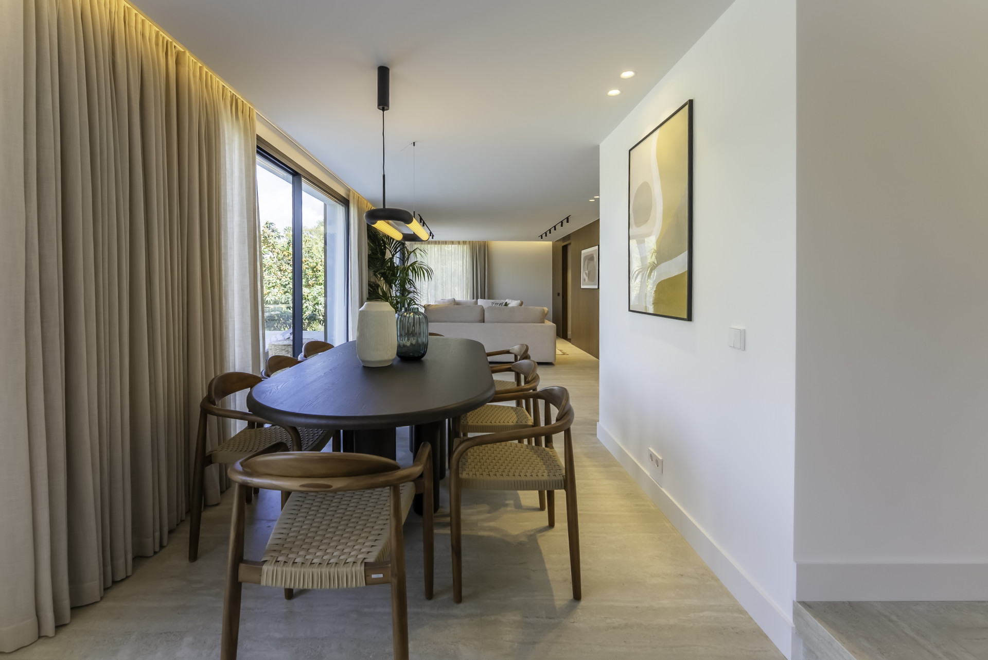 Newly completed luxury residence situated in the prestigious El Rosario area of Marbella. Designed by renowned architect Egle Prunskaitė Brazule, the villa masterfully combines modern aesthetics with functional living across three elegant levels. The villa features six spacious bedrooms, six full bathrooms, and three additional guest toilets. The ground floor offers an open-concept living and dining space, a state-of-the-art kitchen, a study, and a guest suite. The first floor includes a lavish master suite with a walk-in closet, three more en-suite bedrooms, a cozy family lounge, and multiple balconies that provide serene views. The basement level hosts a recreation area with a pool table and media zone, a home office, utility rooms, and direct garden access. Outdoors, the villa offers a beautifully landscaped garden, a swimming pool with lounge, expansive terraces ideal for dining and entertaining, and a fully equipped barbecue zone. Additional amenities include a private gym, sauna, underfloor heating, a smart home system, an electric vehicle charging station, a double garage, and a covered carport.