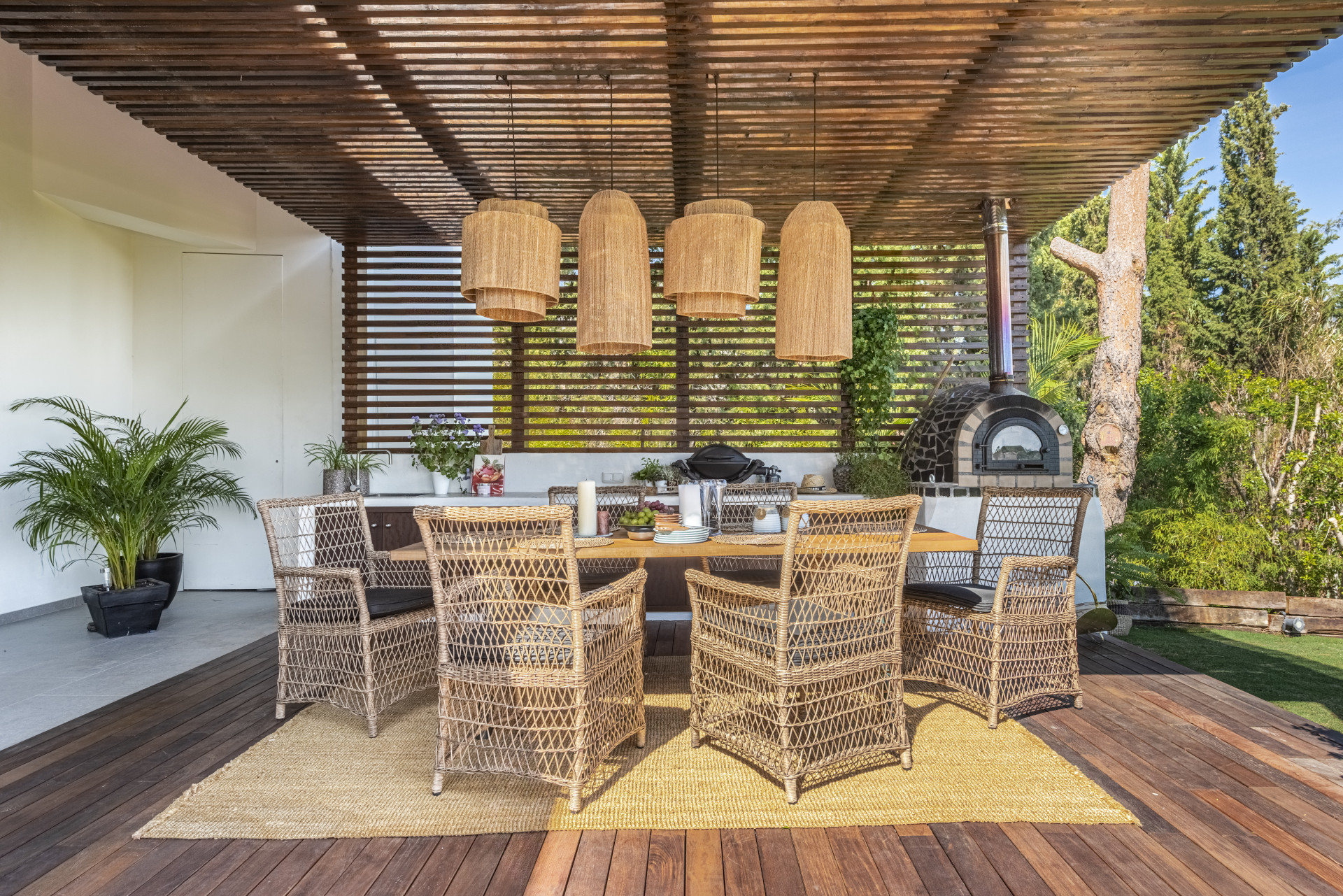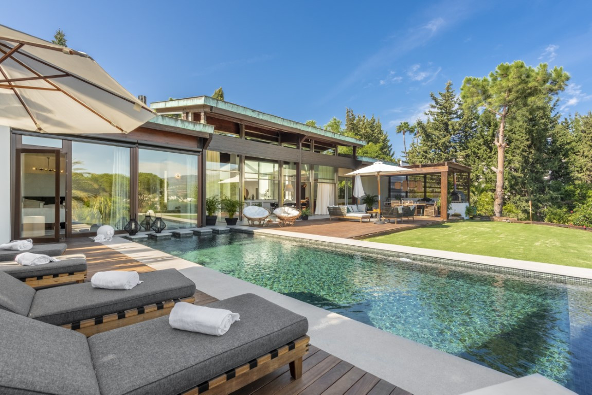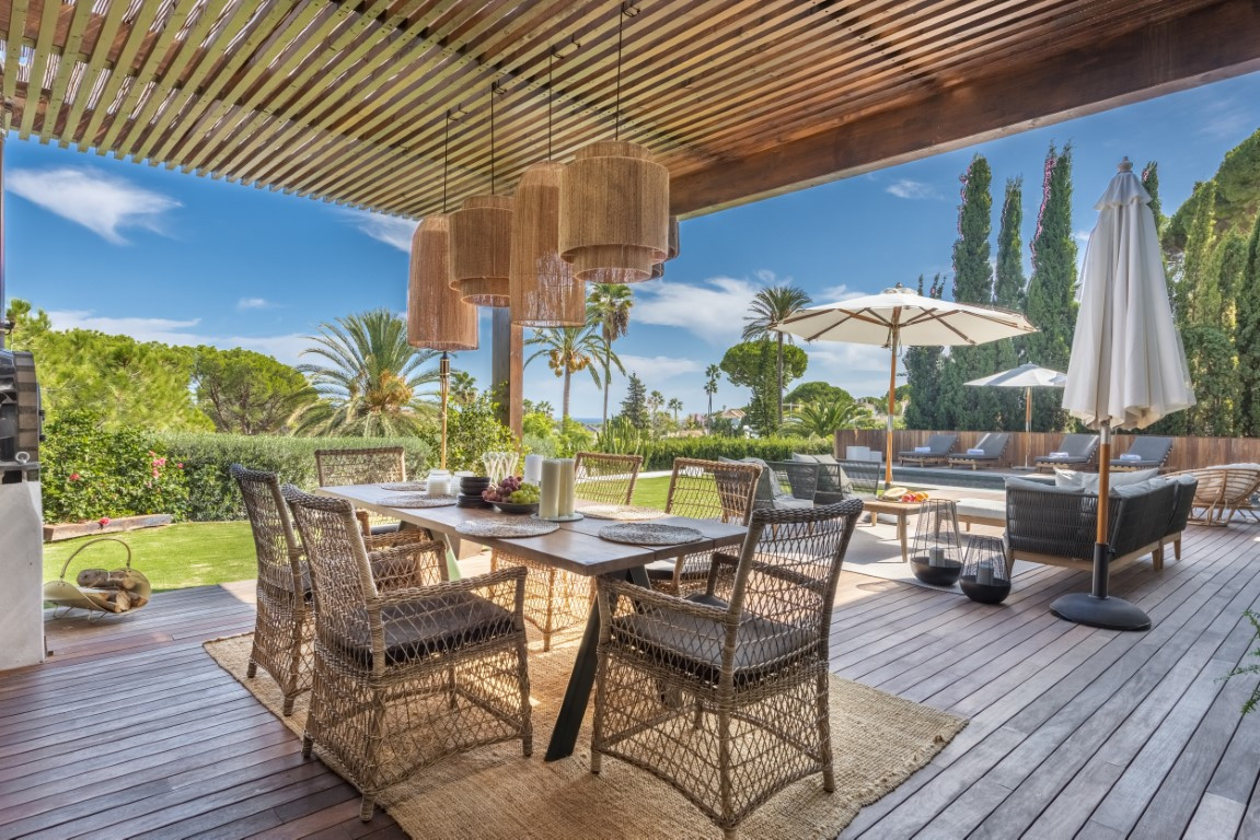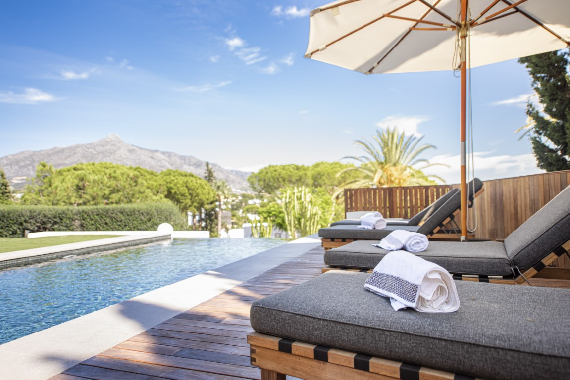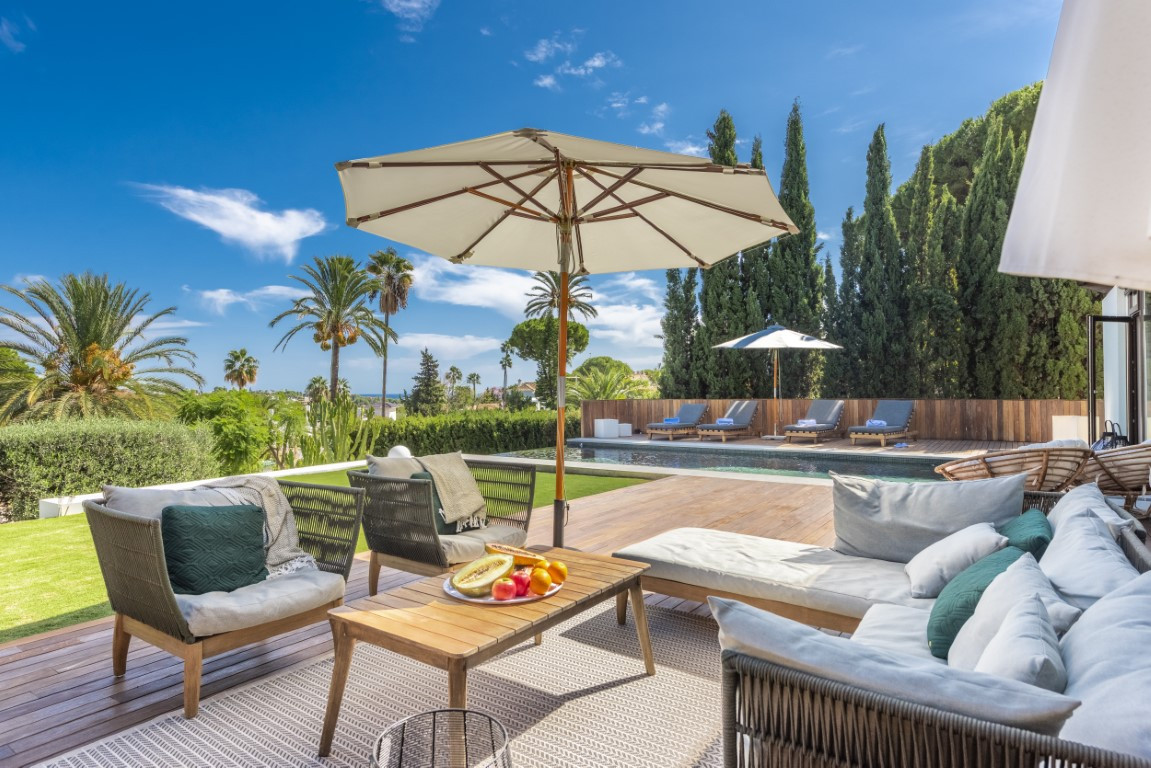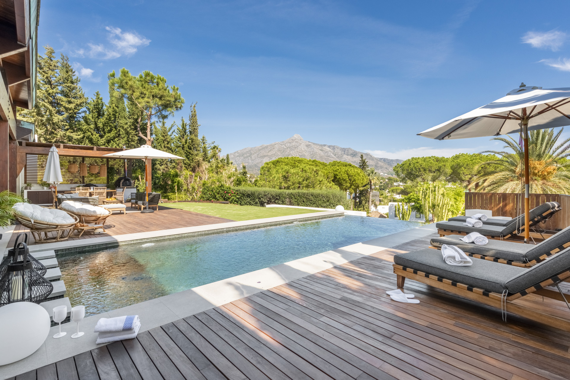 Gorgeous Bali style six bedroom, south facing, totally refurbished villa in the heart of Las Brisas, close to Los Naranjos Golf and only a short drive down to Puerto Banus, its sandy beaches, best restaurants and exclusive boutiques together with other amenities. On the lower level of this property you find a spacious gym room, entertainment/ cinema room, three guest bedrooms and an access to an enchanting patio. On the upper level there is an open plan modern kitchen leading to the living-dining area with direct access to the private terrace, garden, outdoor kitchen with a dining area and infinity swimming pool with amazing mountain views; the master suite with a walk-in closet and also with an access to the terrace and garden and two more guest suites. Other features include a garage, fitted wardrobes and hot and cold air conditioning.