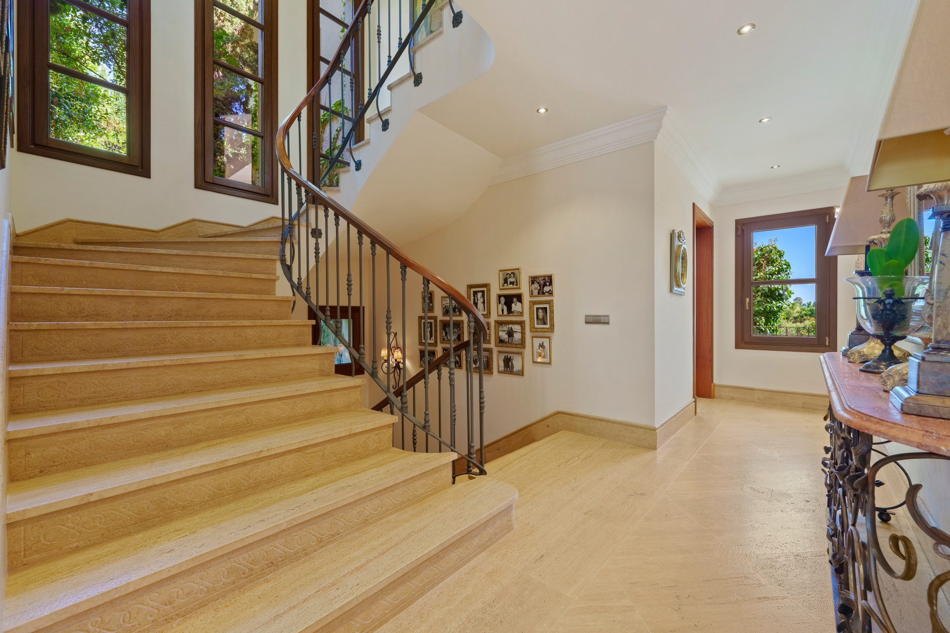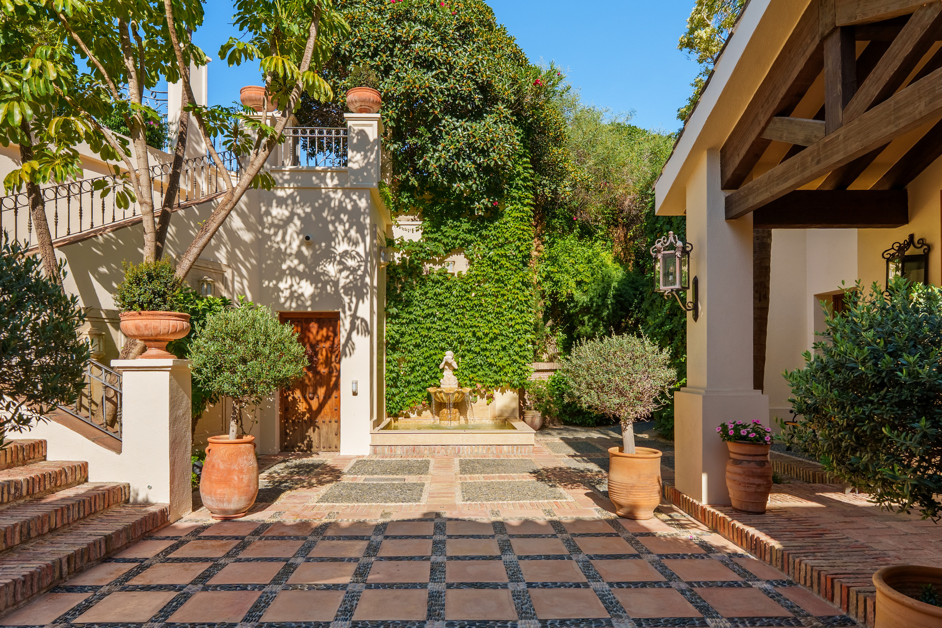 Stunning six-bedroom, south-facing villa located in the prestigious area of Lomas de Marbella Club, on Marbella’s sought-after Golden Mile. This beautifully maintained property is just a short drive from the beach and all amenities, offering an ideal blend of luxury, comfort, and privacy. Each of the six bedrooms has its own en-suite bathroom, and the master suite boasts two en-suite bathrooms, bringing the total number of bathrooms to nine. This villa is a fantastic opportunity for use as a permanent residence or a luxury holiday home, thanks to its generous layout, top features, and unbeatable location. The main floor includes a bright and spacious living room with direct access to the pool and terraces, a formal dining room, a fully fitted kitchen, and one guest bedroom with an en-suite bathroom, also with access to the pool area perfect for indoor-outdoor living. The lower level of the property offers a range of amenities including a library, a cozy TV lounge with private bar, wine cellar, gym, and a laundry area with an additional kitchen. This floor also features three bedrooms with en-suite bathrooms, each with direct access to a lower garden level, providing added privacy and independence. The top floor is dedicated to the impressive master suite, featuring two en-suite bathrooms, a private sitting area or lounge, and access to multiple terraces with lovely views. Additionally, the property includes a separate guest apartment with its own en-suite bathroom ideal for visitors or staff. The beautifully landscaped garden boasts a heated swimming pool, several terrace areas, and a fully equipped outdoor bar and kitchen, ideal for entertaining. Additional features include centralized air conditioning, marble flooring throughout, fireplace, storage room, and a private driveway with parking for up to three cars. This exceptional villa blends Andalusian charm with modern luxury in one of Marbella’s most exclusive residential areas.