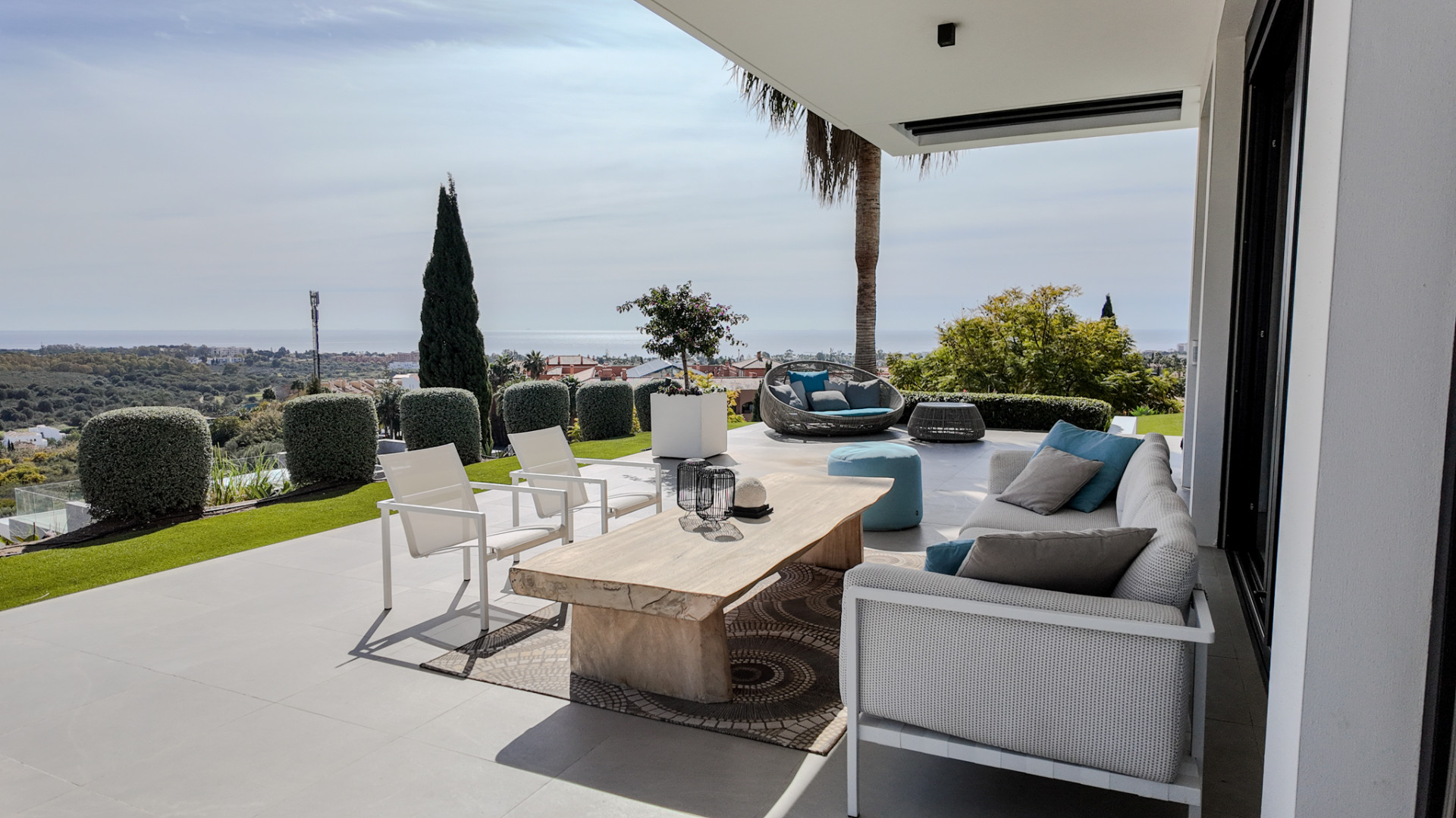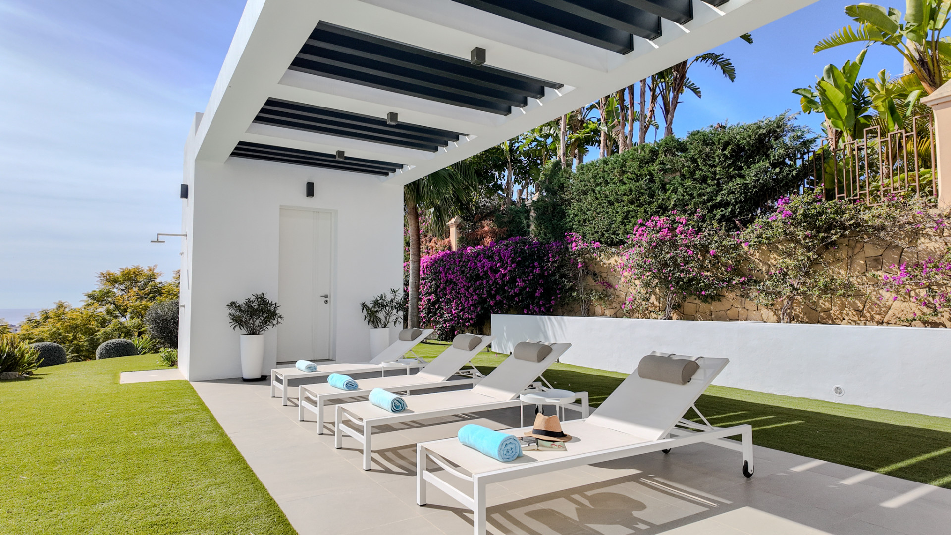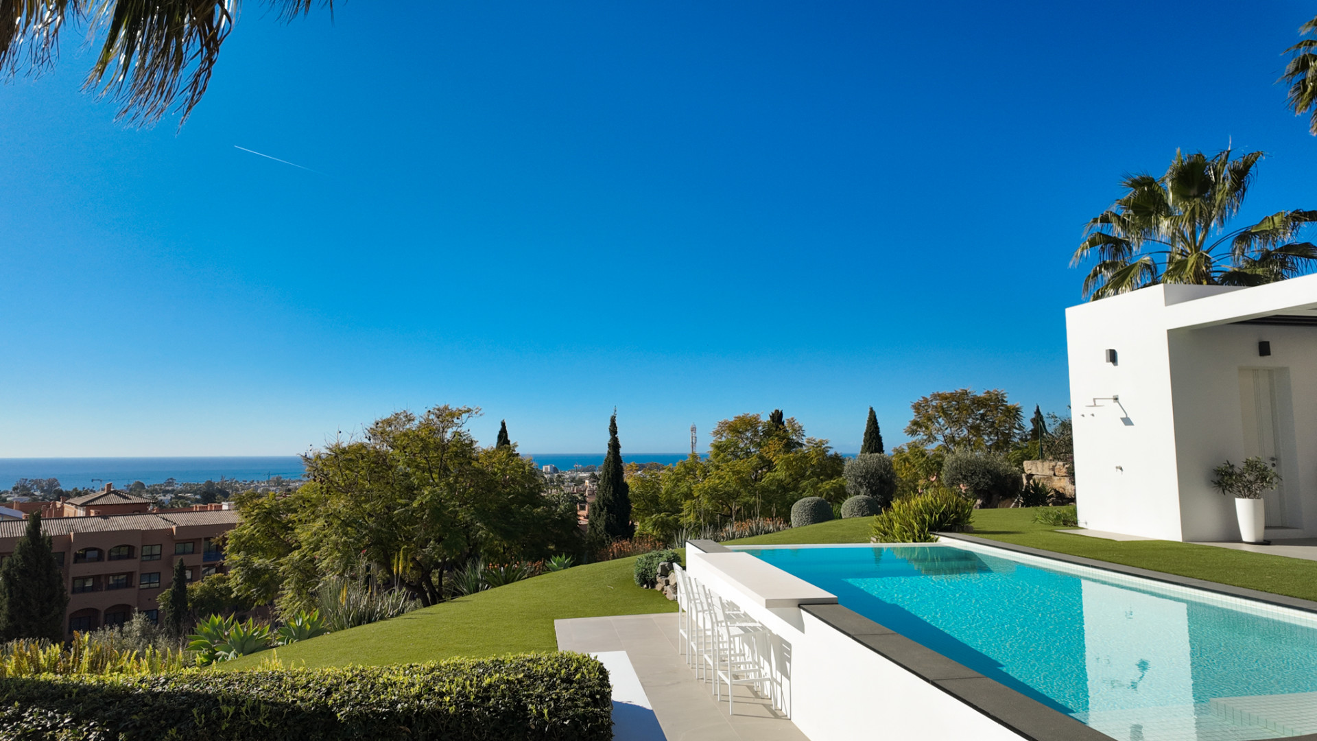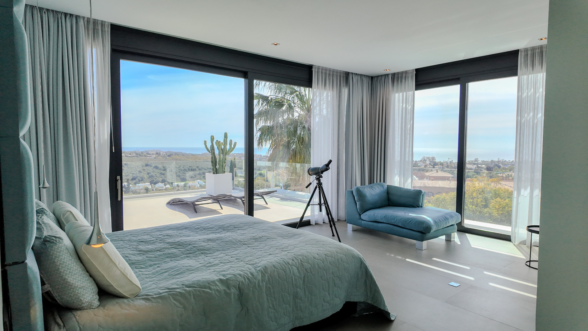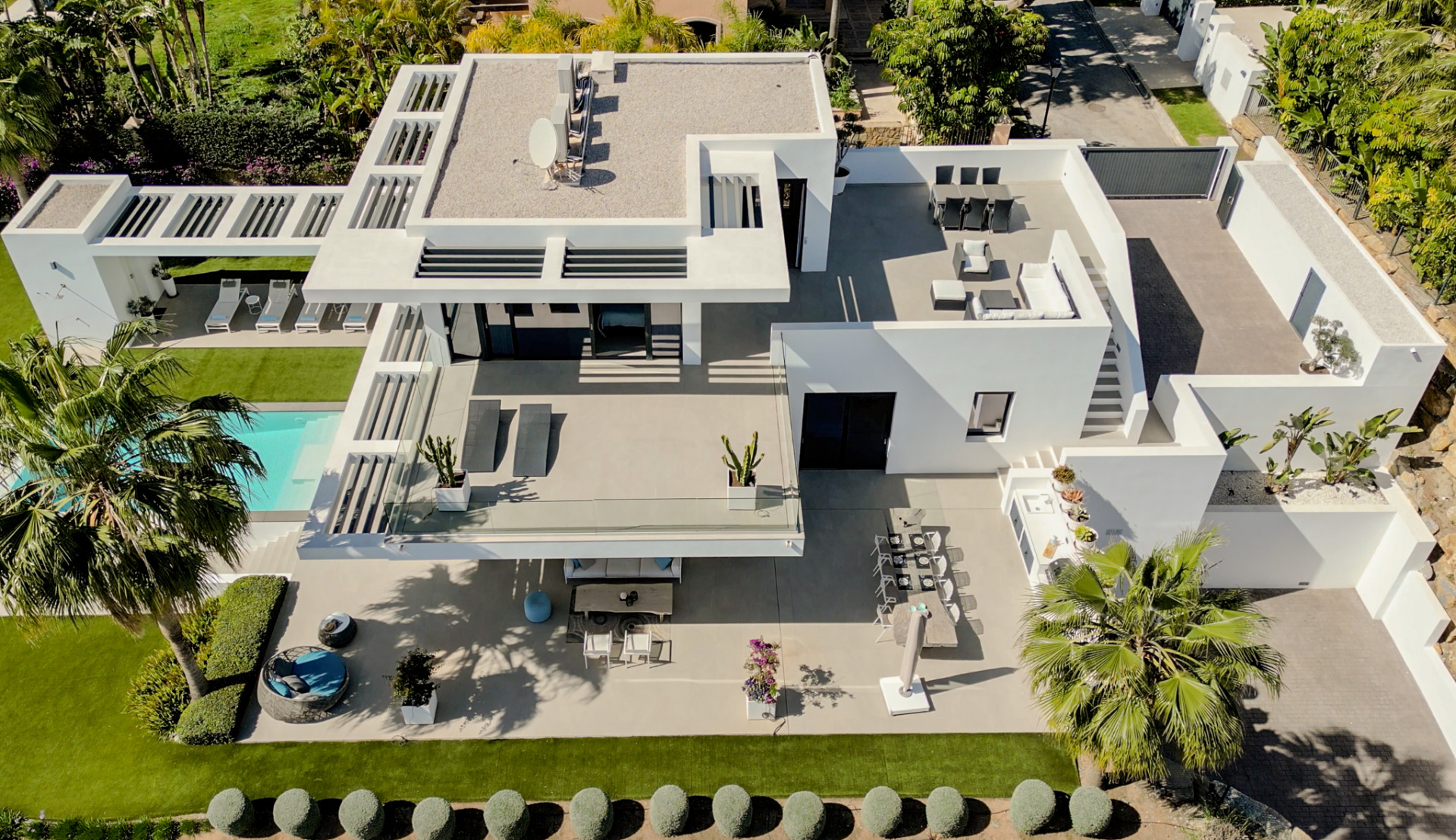 Fantastic south facing, four bedroom contemporary villa in the heart of the exclusive golf resort Los Flamingos; one of the most prestigious and highly desirable developments on the Costa del Sol. The location gives you easy access to all kinds of amenities that are just a stone’s throw away. It is close to the sea and beaches, and just a short drive to shopping areas, restaurants, international schools, sports facilities and all attractions of Puerto Banus and Marbella. Aside from three 18-hole golf courses Los Flamingos is also home to the Anantara Villa Padierna Palace Hotel. The property is located on a private, elevated plot, at the end of a cul-de-sac road and in one of the nicest streets in Los Flamingos. Entering the villa, you will be blown away with the outstanding panoramic sea views. The open-plan design allows a seamless flow between the living, dining, and kitchen areas, creating a sense of spaciousness and freedom, as it extends to a beautiful outdoor living area, undoubtedly one of the key features of this modern home. The villa offers a lifestyle of comfort, sophistication, and relaxation for those seeking the epitome of modern living.