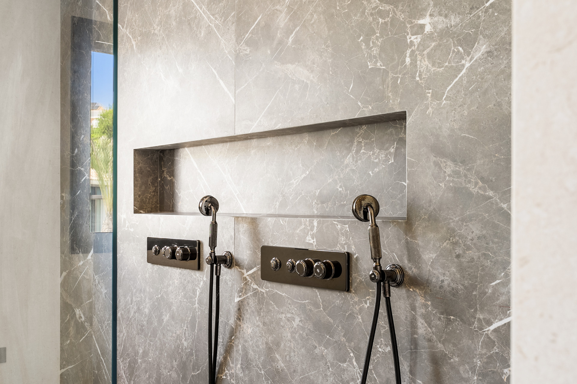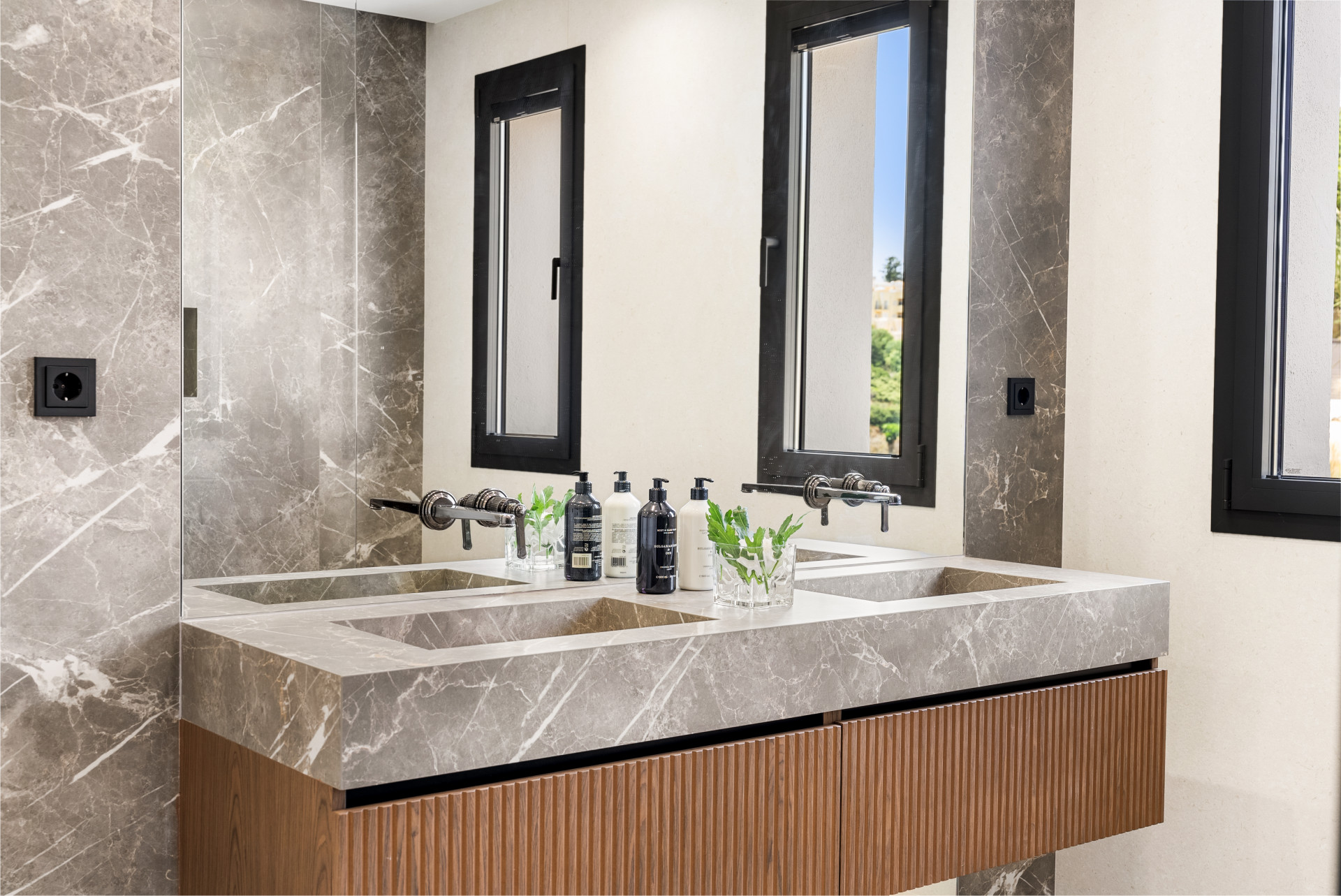 Beautiful villa with traditional tiled roofs and sleek modern interiors. This striking residence offers double-height ceilings and expansive floor-to-ceiling windows that flood the home with natural light. Spanning three levels, all seamlessly connected by a private lift, the layout is thoughtfully designed to balance scale, flow, and everyday comfort. The main floor features open-plan living and dining areas that flow effortlessly into a fully equipped Gaggenau kitchen, complete with premium Italian cabinetry. Six en-suite bedrooms are thoughtfully distributed throughout the home, complemented by a spacious office that can easily serve as a seventh bedroom. The lower level enhances the living experience with a second lounge and kitchenette, a private cinema room, a fully equipped gym with steam room and shower, and a dedicated laundry area. Every bathroom is finished with luxurious Gessi fittings and grand-format Italian porcelain tiles. Outdoors, a beautifully landscaped plot surrounds the heated saltwater pool and a series of sun-soaked terraces, perfect for year-round al fresco living. Additional features include a three-car garage and generous driveway parking. Spacious, stylish, and supremely private, this home is purpose-built for refined family living.