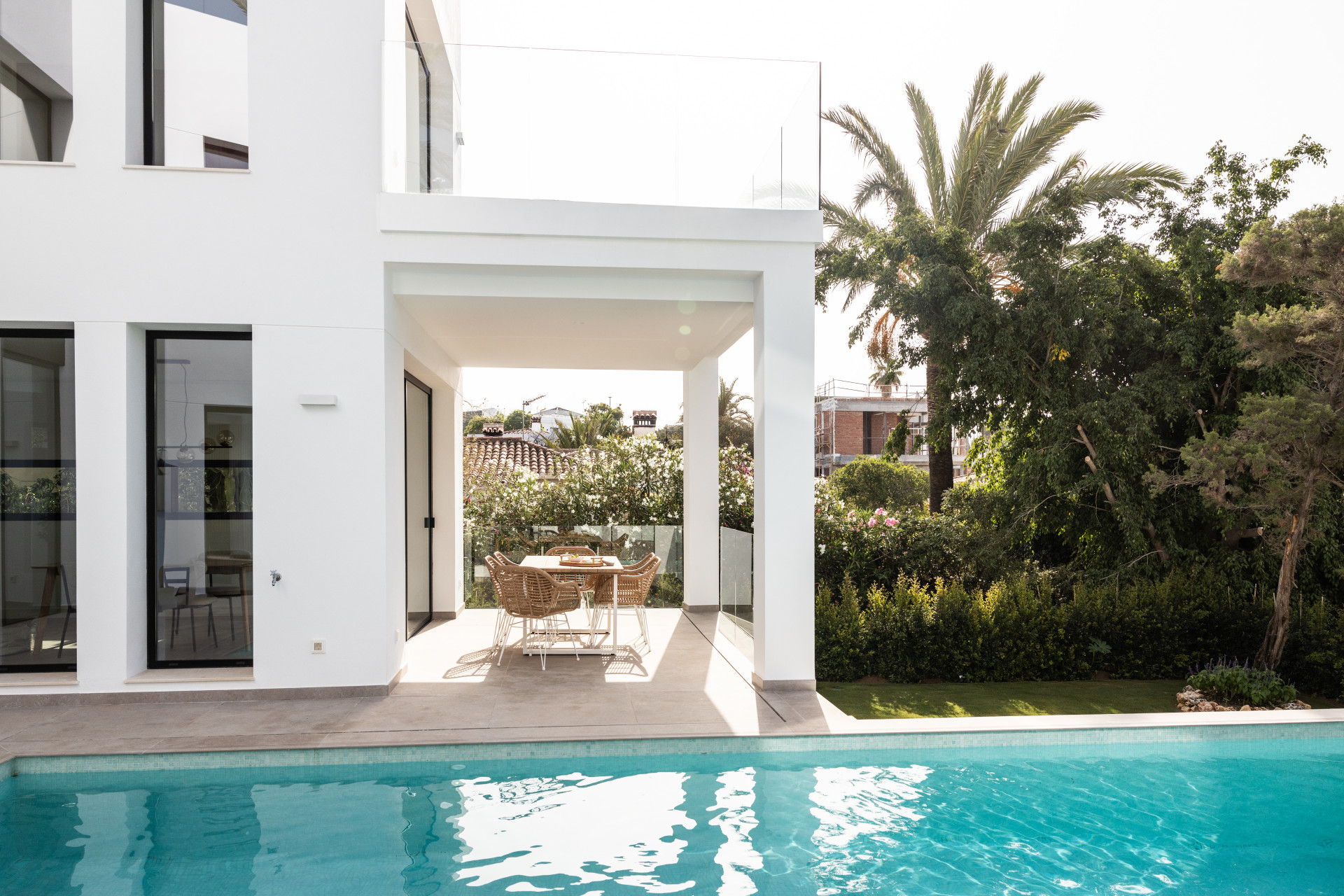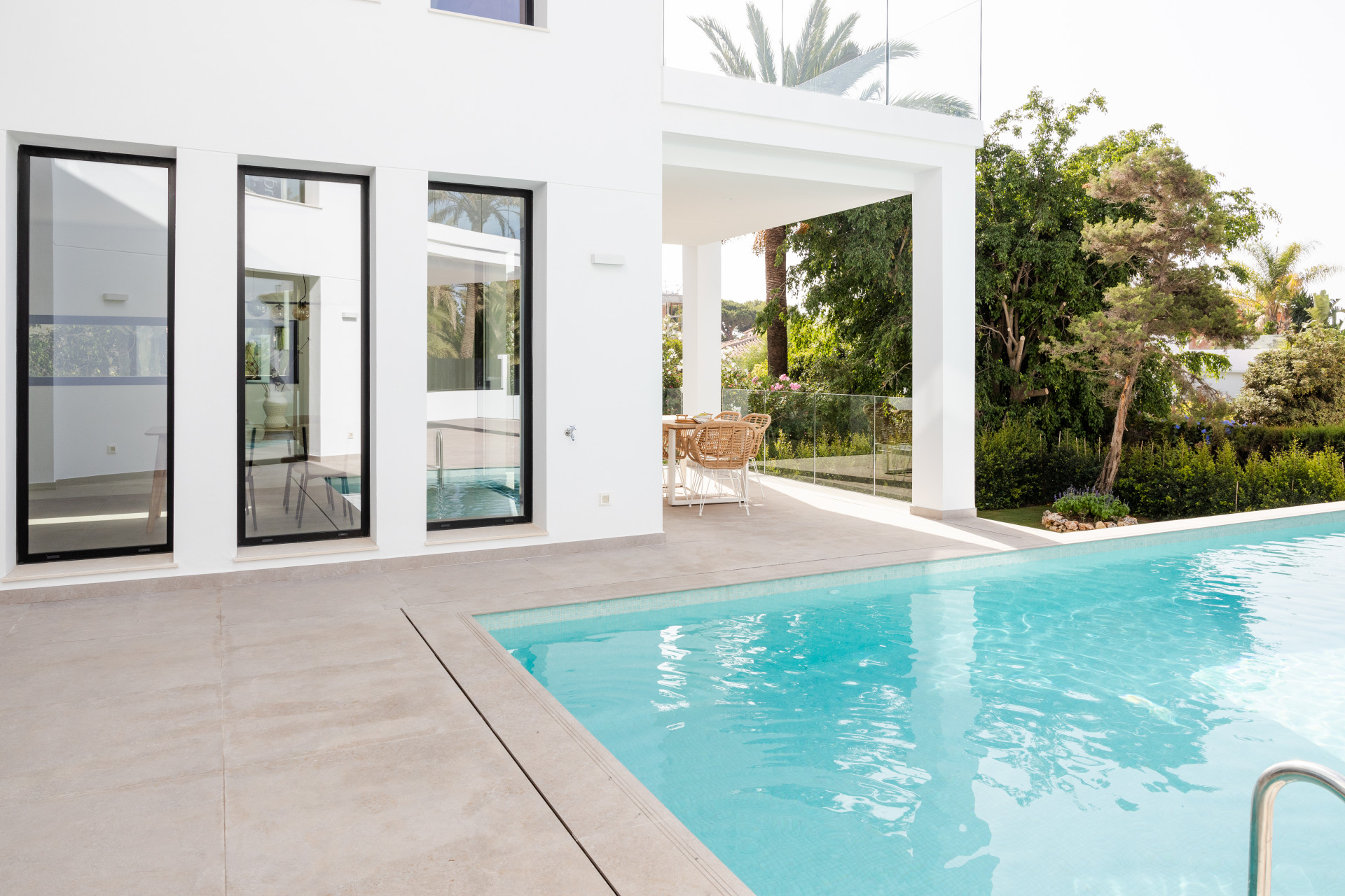 This beautifully renovated modern Andalusian villa, located in the prestigious Marbesa neighborhood of Marbella East, offers a perfect blend of luxury and tranquility. Originally built in 1990, it underwent a complete transformation in 2024, seamlessly combining contemporary elegance with traditional charm. Spanning two floors, the villa features four spacious bedrooms and four bathrooms. High-quality materials like natural oak wood and porcelain floors enhance its sophisticated aesthetic. The open-plan first floor integrates the kitchen and living area, leading to an outdoor terrace ideal for al fresco dining. The ground level offers flexible space for a secondary living area or gym, with direct access to a stunning heated saltwater pool and landscaped garden. A rooftop terrace with panoramic sea views, pre-fitted for an outdoor kitchen and ethanol fireplace, provides the ultimate entertaining space. Designed for comfort and security, the property includes an advanced alarm system, double-glazed windows, and automatic irrigation. Ample parking accommodates up to four vehicles within a gated perimeter. Marbesa’s prime coastal location offers access to pristine beaches, water sports, and top-tier dining, including the popular Simbad Restaurant & Beach Club. Essential amenities, shopping centers, and reputable international schools are all within easy reach.
