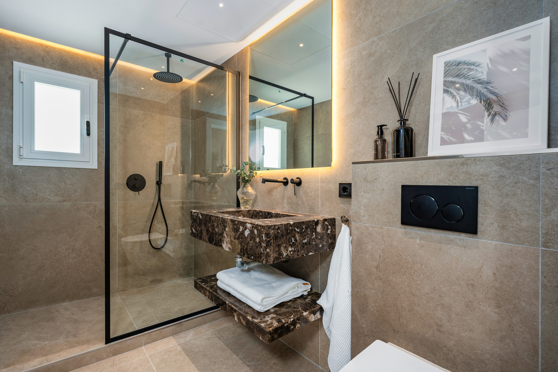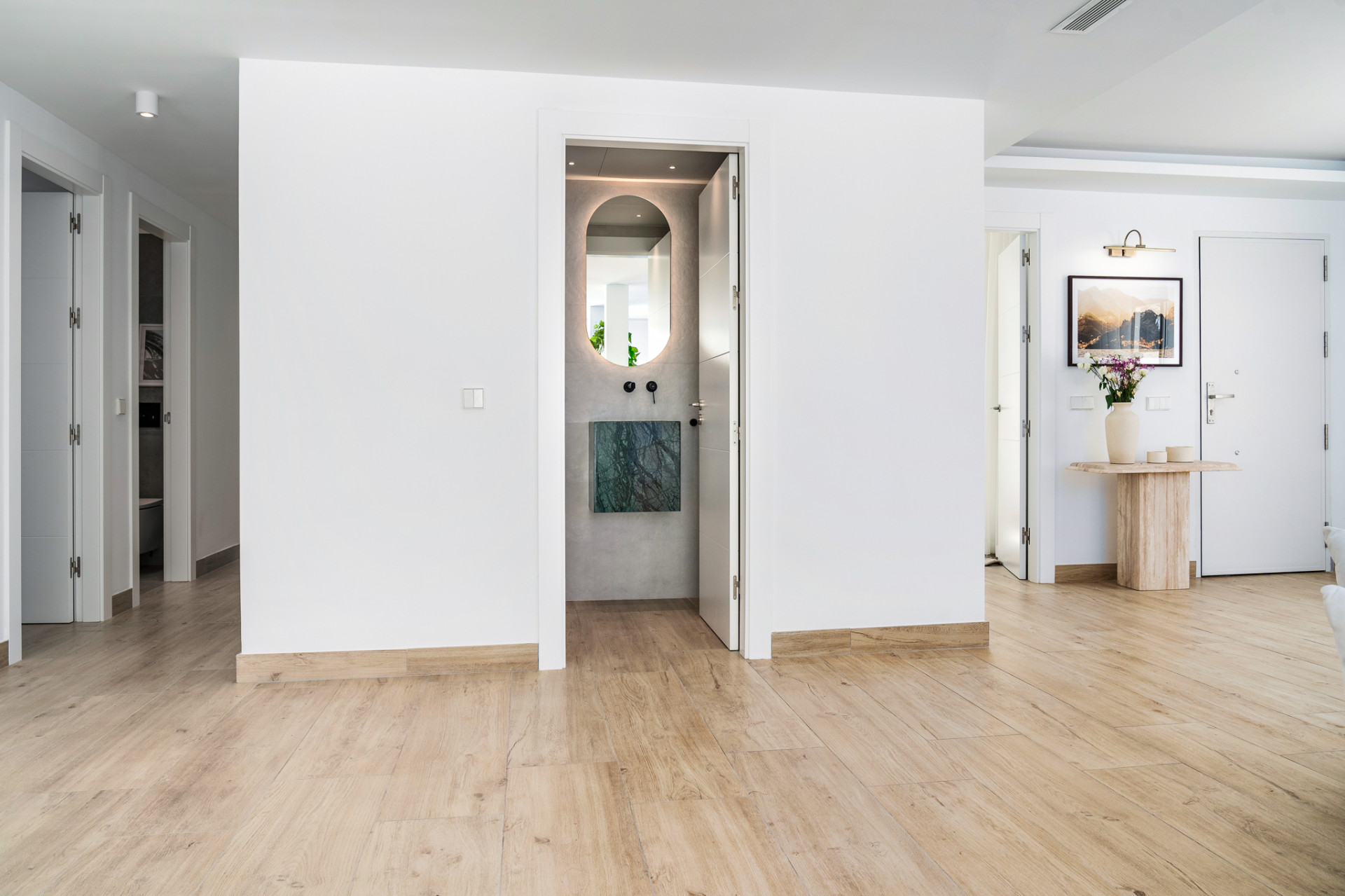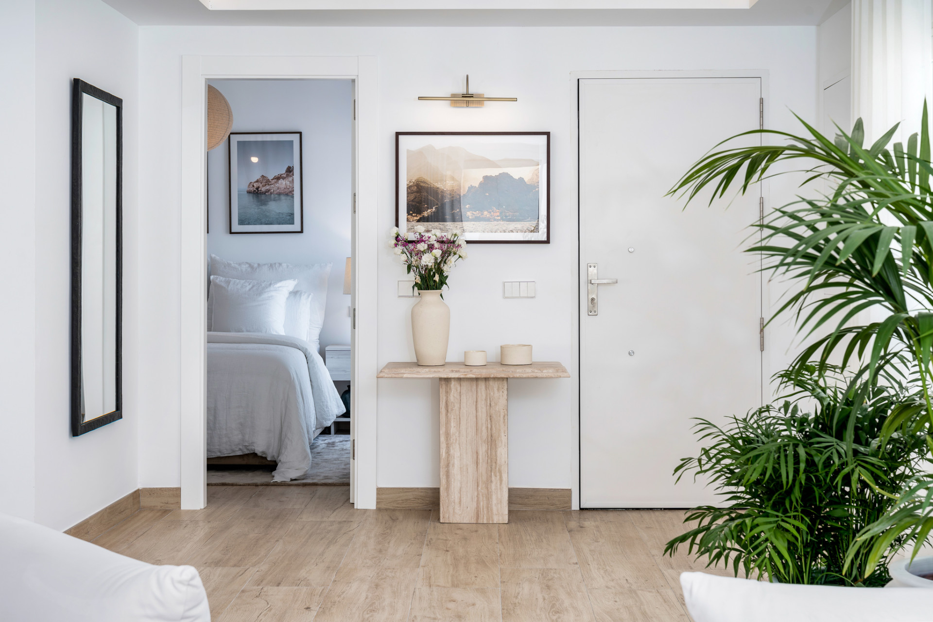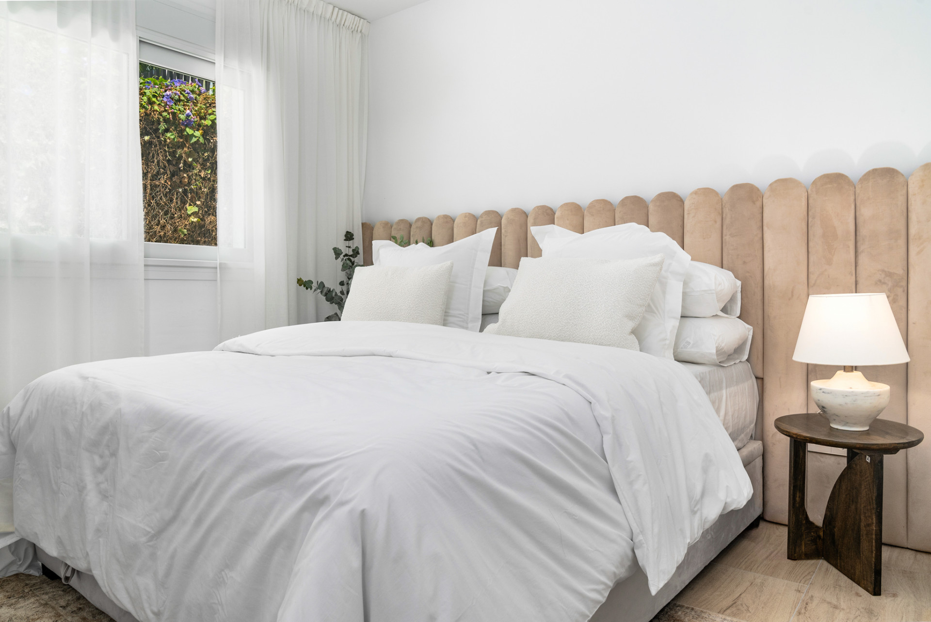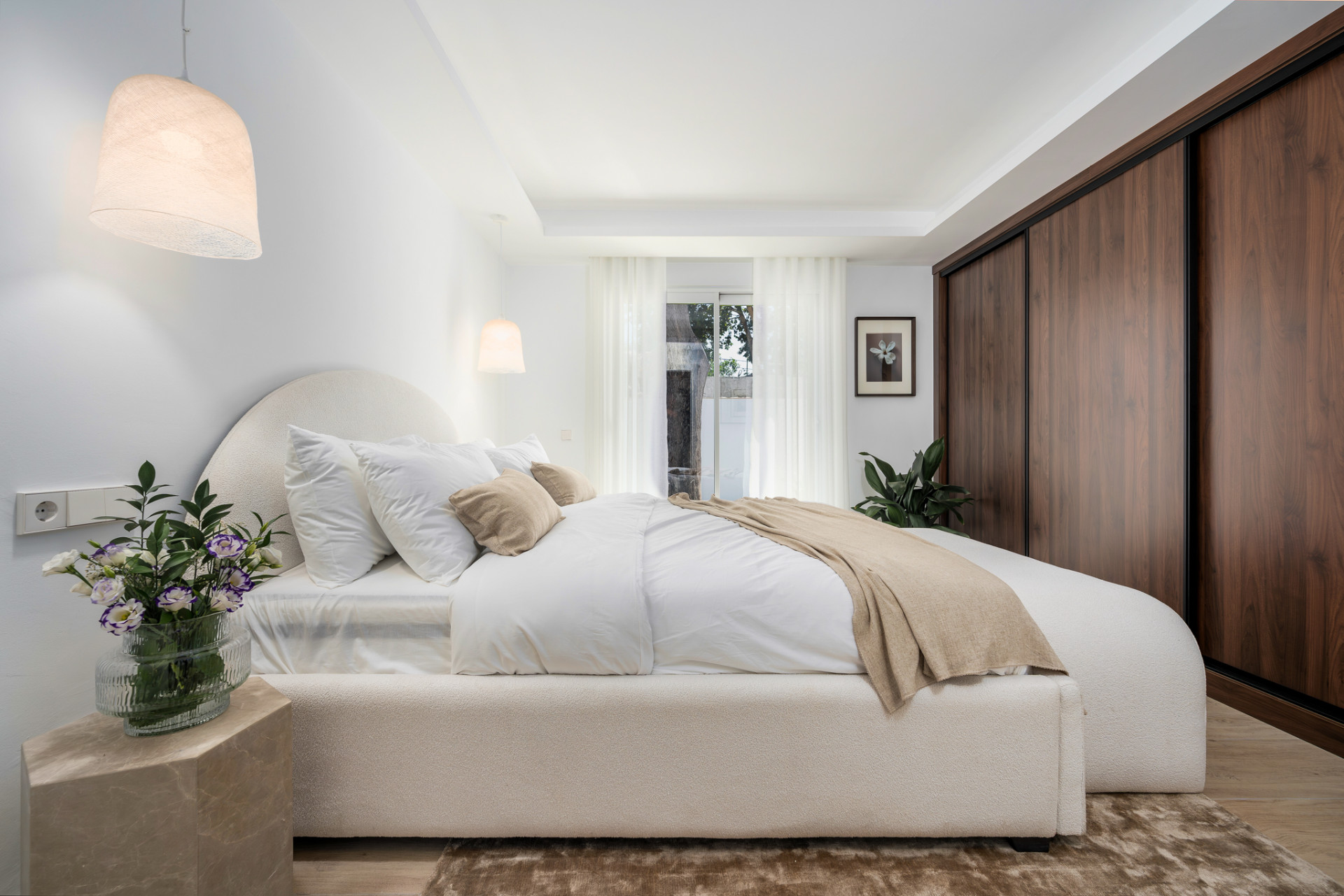 Beautiful completely renovated, single-floor villa offering the epitome of Modern Boho style living in the heart of Nueva Andalucia. This four bedroom, three bathroom has just been renovated in 2023 with high-quality materials like wood, ceramic, and marble, and comes furnished with custom-made, high-quality pieces. When you enter, you’re immediately welcomed into an open-plan kitchen and living area that extends out to a chic Ibiza/Boho-inspired Garden through large sliding doors. This private oasis offers a diverse range of outdoor experiences from dining and barbecue areas to chill-out zones all set against a backdrop of lush palm trees and greenery. The first guest bedroom to your right, as well as the en-suite master at the end of the hallway, offer large sliding doors that open out to this exquisite garden. Two additional guest bedrooms can be found to the left, sharing a separate bathroom. The garden features a modern swimming pool strategically positioned just steps away from the kitchen and living area. The villa has a private road leading to the entrance of the house, complete with parking inside of the gates.