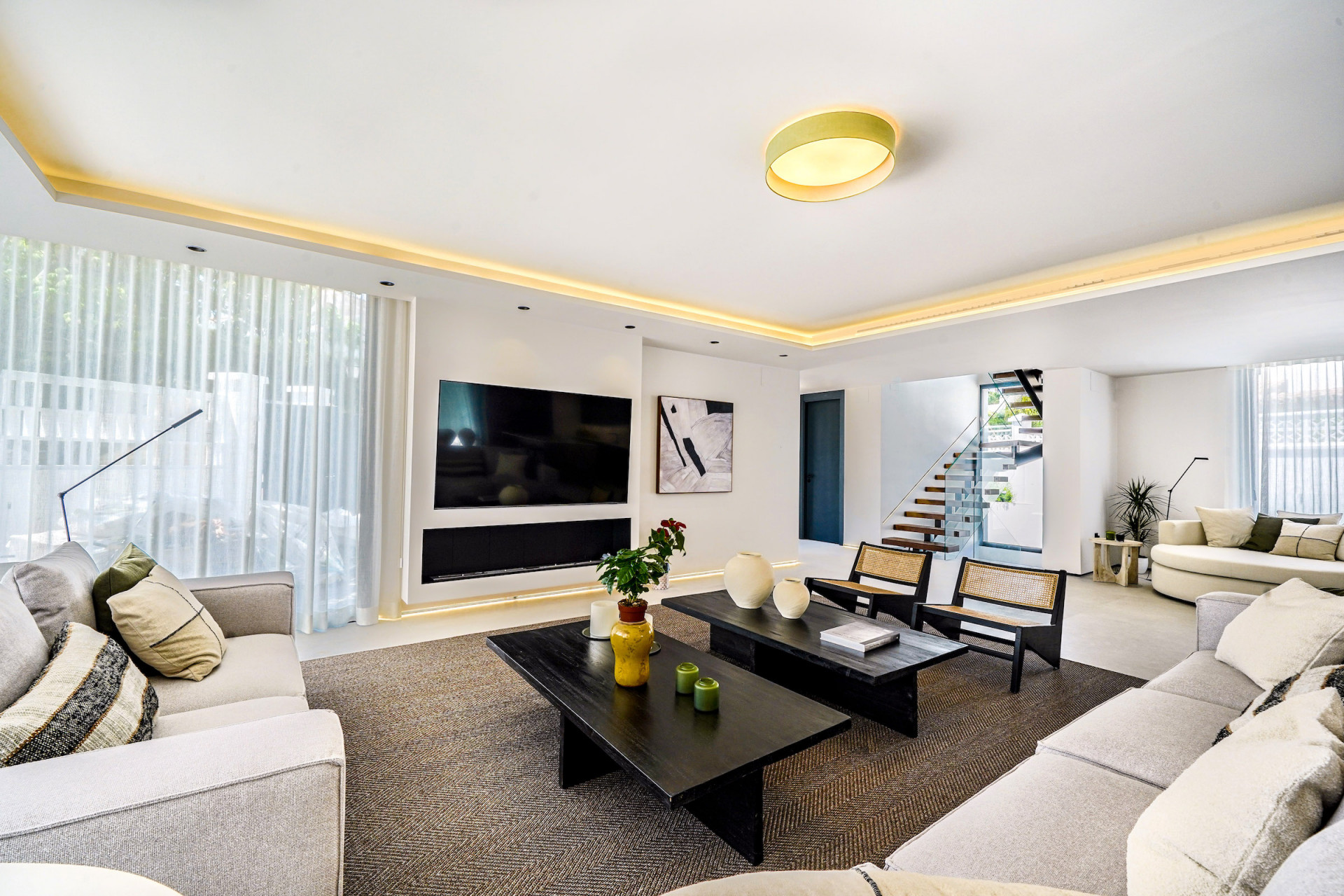 Beautiful villa has just been completely reformed in a modern contemporary style and is located in Nueva Andalucia, just a short walk from services and restaurants. The villa is in a no-through road, guaranteeing a peaceful and private location, free of traffic. Upon entering on the villa we find a spacious open plan configuration, with large windows that allow plenty of natural light into the property. This area incorporates the kitchen, with island and completely fitted out with quality appliances including a wine fridge, the dining area and the living area with fireplace . There is also a breakfast area and several terraces to enjoy the ambient climate. The laundry room and storage are in a separate area. On the upper level we find three bedrooms, all with modern ensuite bathrooms and two of the bedrooms have a nice terrace. On the lower level of the property, we find two more bedrooms, two bathrooms, a TV / Cinema room and a games room with pool table / table tennis table. There is also an office on this level. Several features have been incorporated into the design such as a Demotic system that controls the lighting, heating, cooling, electric blinds and the security. Everything can be controlled via a mobile smartphone. The villa has security cameras both inside and outside the villa and these cameras can also be accessed from a smartphone. The landscaped gardens offer beautiful and open views of La Concha mountain and the villa also offers total privacy.