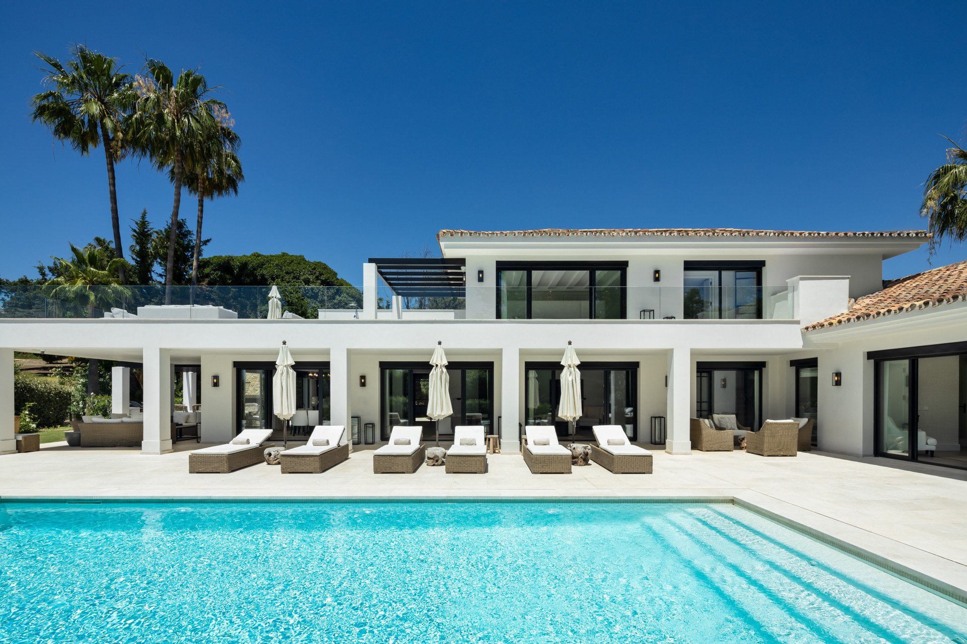 ntroducing a stunning villa that seamlessly combines timeless exteriors with luxurious interiors, situated in the prestigious Nueva Andalucía—one of Marbella's most sought-after locations. This exquisite residence offers an unparalleled outdoor experience, featuring a large swimming pool, a sunken chill-out area, and spacious zones designed for alfresco dining and lounging. The entrance showcases a covered carport for two vehicles and an architecturally striking design that leaves a lasting impression. Its enviable frontline golf position provides breathtaking views of the course, which can be admired from the villa's expansive terrace.