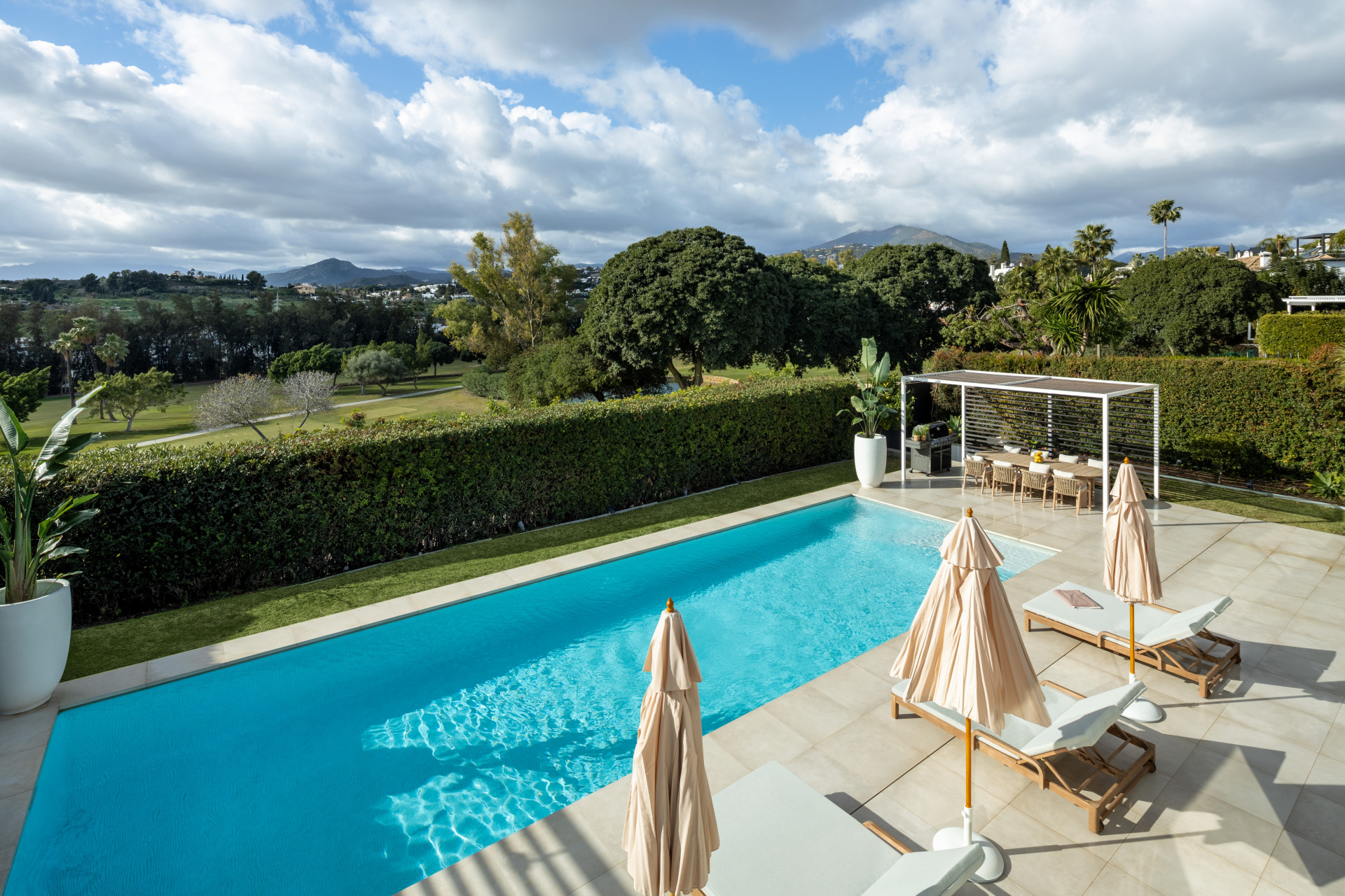 Welcome to a modern frontline golf villa in the heart of Nueva Andalucía, where contemporary design meets luxurious comfort for an exceptional living experience. This stunning property features expansive terraces ideal for entertaining, along with a private outdoor pool that invites relaxation under the Mediterranean sun. A private driveway adds convenience, while breathtaking golf and mountain views can be enjoyed from every angle. Step inside to a bright and airy open-plan living space, seamlessly connected to a sleek modern kitchen. The master suite serves as a serene retreat, offering direct terrace access and a grand master bathroom that radiates elegance and natural charm. Every element of this home has been thoughtfully designed to balance style and functionality. Additional highlights include a state-of-the-art home gym, a private home cinema for ultimate entertainment, and a spectacular solarium with a jacuzzi, providing panoramic views and a tranquil space to unwind. Perfectly positioned near world-class amenities, prestigious golf courses, and the vibrant marina of Puerto Banús, this villa offers the best of Marbella’s coveted lifestyle. Whether hosting guests, enjoying a peaceful escape, or indulging in the dynamic energy of Nueva Andalucía, this exceptional home exceeds every expectation.