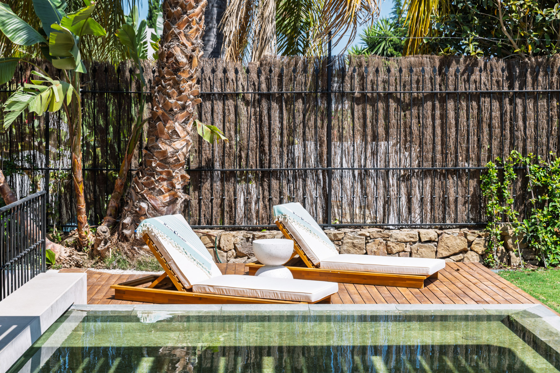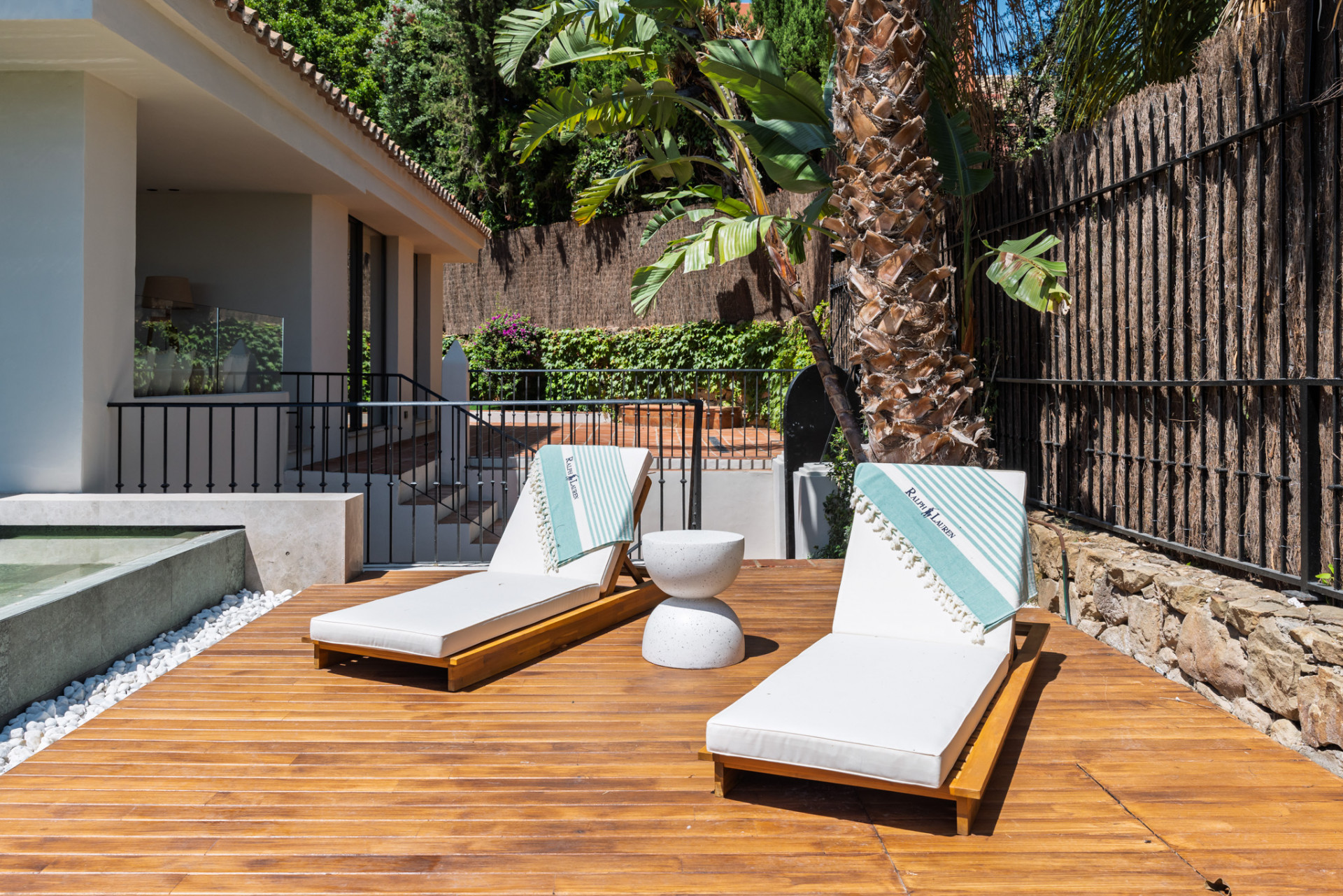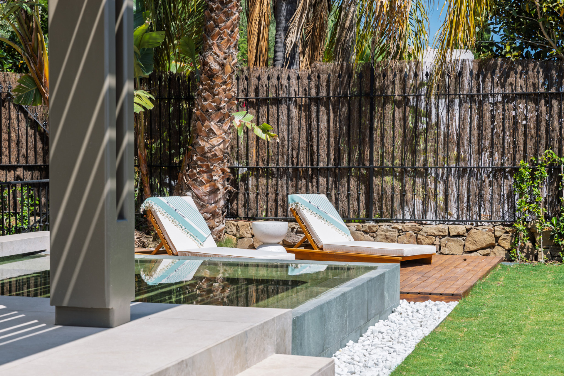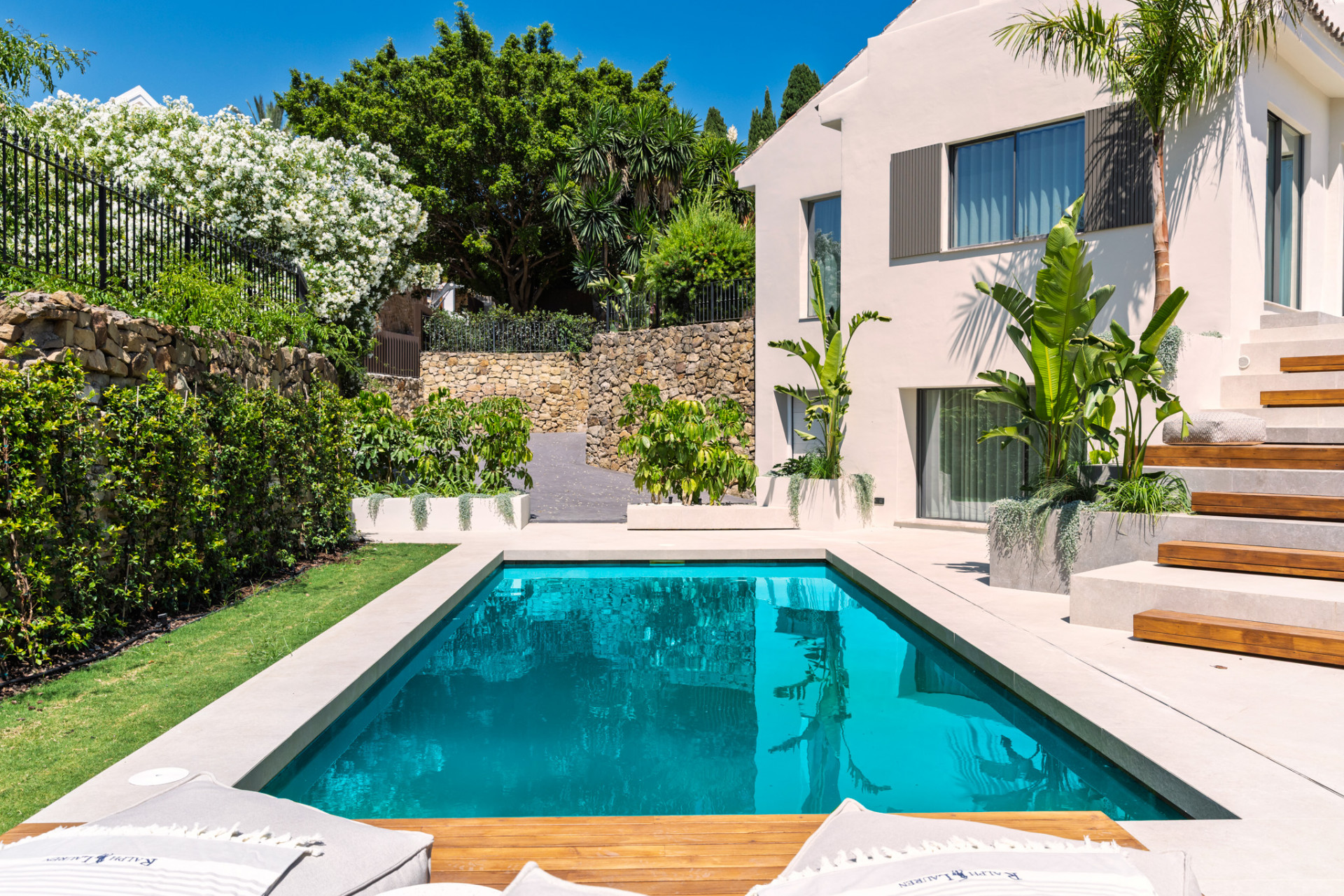 This exceptional luxury villa in Marbella’s prestigious Golf Valley was fully redesigned in 2025, combining contemporary architecture with Balinese boho inspiration and lush tropical aesthetics. Ideally located near golf courses, international schools, fine dining, and Puerto Banús, it offers both serenity and accessibility. Surrounded by a beautifully landscaped tropical garden with multiple terraces and chill-out areas, the villa features bright, open interiors with high ceilings, natural finishes, and seamless indoor-outdoor integration. It includes five bedrooms (five en suite), six bathrooms, a stunning master suite with walk-in closet and panoramic views, plus an independent guest apartment. The basement adds a bar, pool access, laundry, customizable leisure space, and a private garage. Sold fully furnished, the property embodies modern elegance, privacy, and harmony with nature—perfect for families or discerning buyers seeking exclusivity and sophistication.