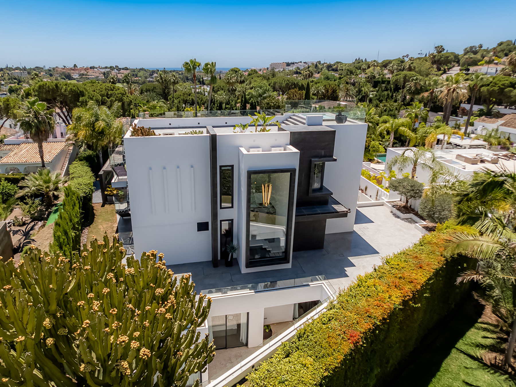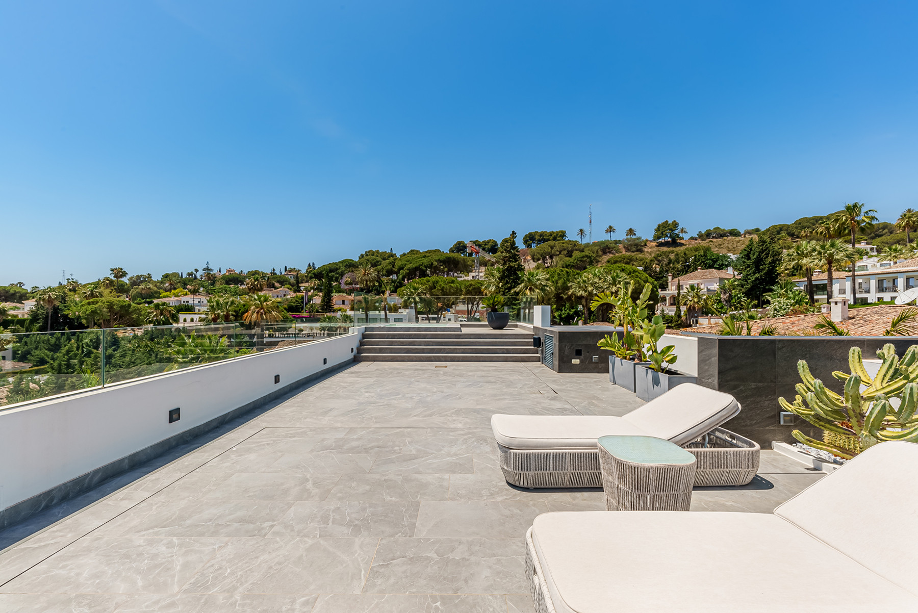 Located in the heart of Las Brisas, Nueva Andalucía, this stunning modern residence perfectly combines elegance, comfort, and contemporary design. South-facing, it offers an expansive private garden with generous outdoor spaces ideal for relaxation or entertaining guests. The lower level features a two-car garage, wine cellar, gym, sauna, TV room, and two inviting bedrooms. On the main floor, an open-plan kitchen equipped with top-of-the-line Gaggenau appliances flows seamlessly into a bright living area that opens onto the outdoor terrace, where you can enjoy the pool, an outdoor kitchen, and a chill-out area with a fireplace. The upper floor includes the master suite and a fourth bedroom, both with access to a magnificent terrace boasting sea views and vistas of the iconic La Concha mountain. From here, stairs lead to the rooftop, an exceptional open-air space complete with a jacuzzi and panoramic views. A property that redefines modern living in one of Marbella’s most exclusive locations.