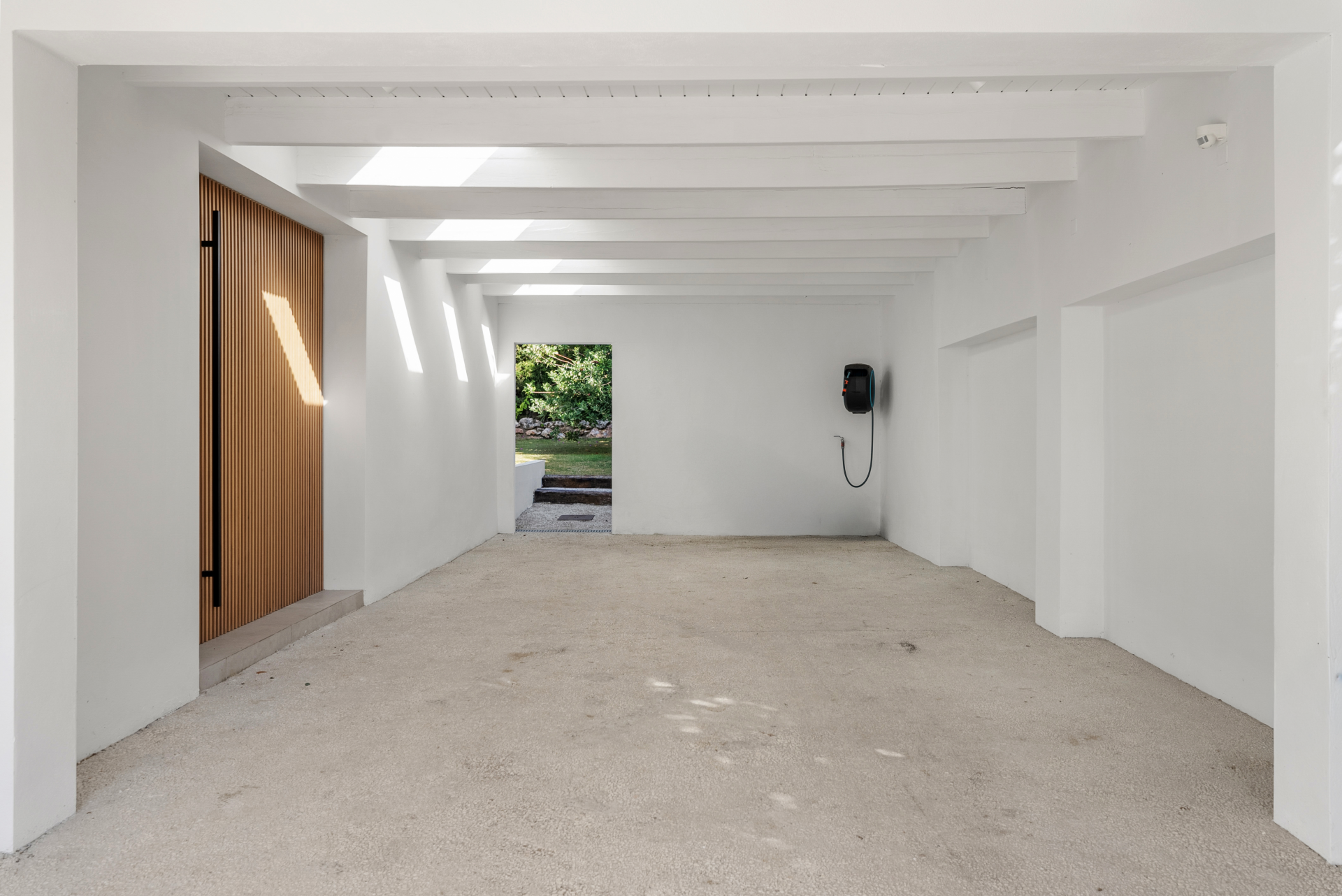 Nestled in the heart of Nueva Andalucía, this Scandinavian-inspired retreat combines sleek modern design with timeless elegance. With a coveted southwest orientation, the property is bathed in sunlight throughout the day, offering uninterrupted panoramic views over Marbella’s prestigious Golf Valley, all set within fully private, immaculately landscaped gardens. The main living space impresses with soaring double-height ceilings, expansive floor-to-ceiling glass doors, a sophisticated fireplace, and a gourmet chef’s kitchen adorned with premium marble countertops and top-of-the-line Miele appliances. Comprising four luxurious bedroom suites, each with elegantly designed en-suite bathrooms, generous walk-in wardrobes, and direct garden access from the lower level, the home perfectly balances comfort and style. The master suite features a private terrace with breathtaking mountain views, while an expansive rooftop terrace invites outdoor entertaining, relaxation, and unforgettable sunsets. Enhancing its appeal, the property offers a fully covered outdoor kitchen, a versatile pool suitable for chlorine or saltwater, a spacious carport for 3–4 vehicles, and a private desalination plant, creating a seamless fusion of contemporary Scandinavian sophistication.